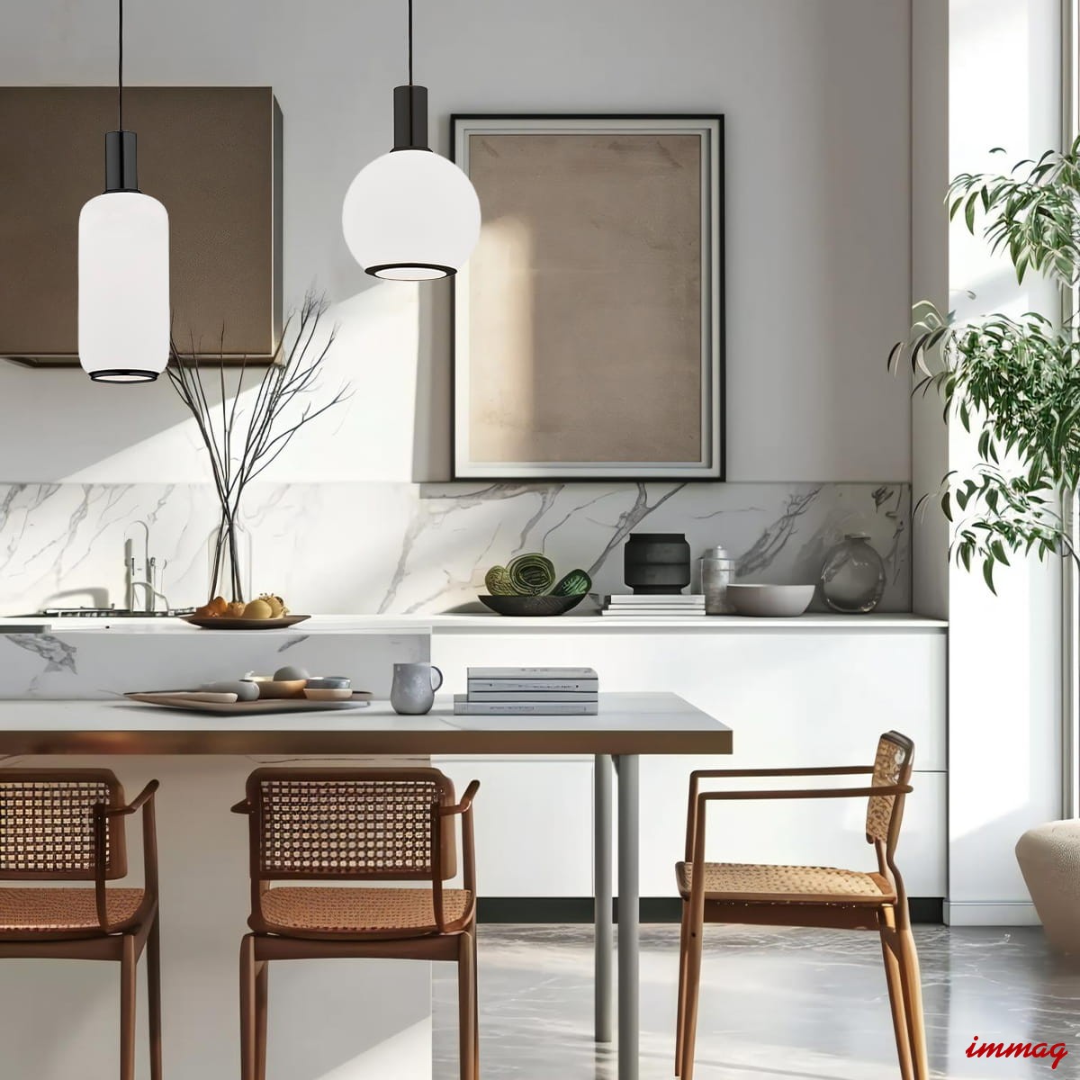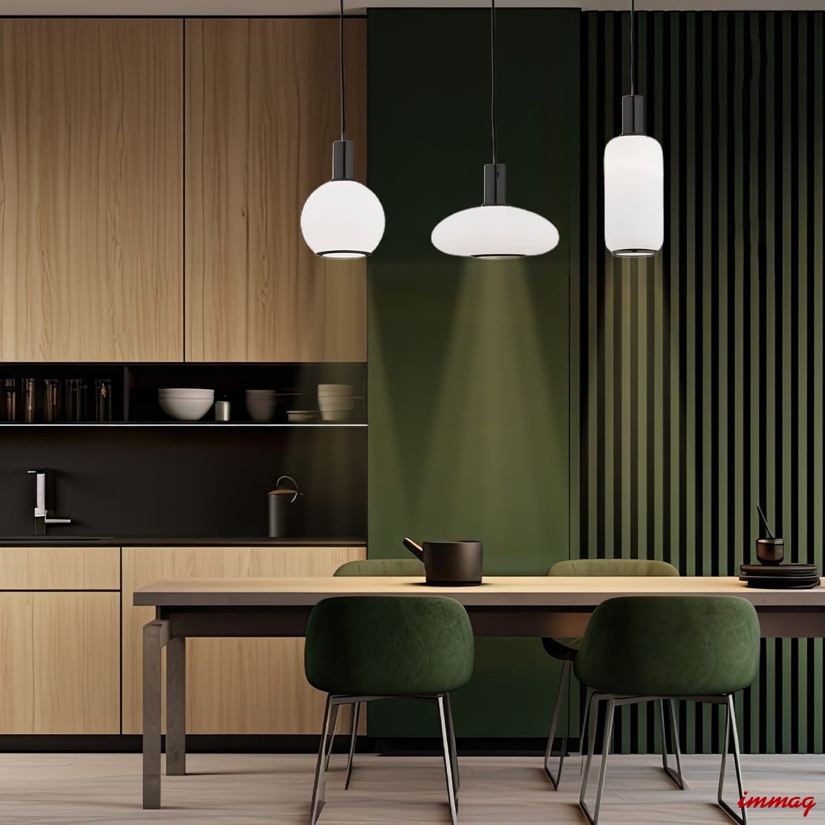Rodzina lamp wiszących łącząca ponadczasowe materiały i kolory. Designerskie klosze wykonane są z mlecznego szkła i zwieńczone czarnymi dodatkami. Całość ulokowana jest również na czarnej podsufitce. Te piękne lampy łączą w sobie elementy klasycznego eklektyzmu z nowoczesnością dlatego świetnie wpisywać się będą w aktualnie modne aranżacje wnętrz i pozostaną na długo atrakcyjnym dodatkiem. Lampy na żarówki E27 wymienne nie sprzedawane z lampami.