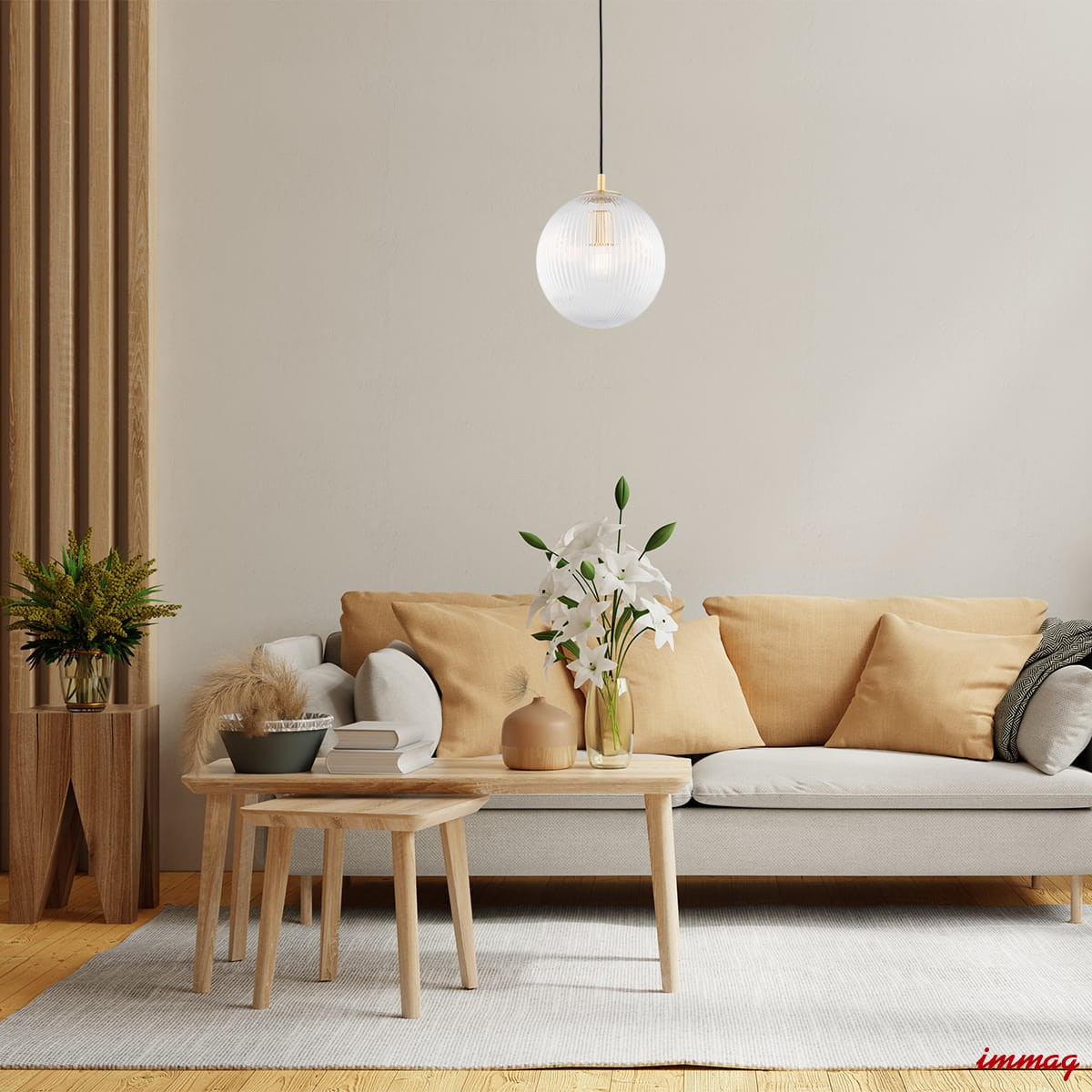 Czy szyk i elegancja we wnętrzach mogą być proste i wręcz minimalistyczne? Czy w bogatych aranżacjach w stylu glamour można postawić na proste formy? Zdecydowanie tak! Doskonałym przykładem jest lampa PALOMA 8517 prosta i okazała lampa wisząca. Spora 25cm szklana kula z transparentnego ryflowanego szkła zwisa na pojedynczym przewodzie, a dopełnieniem jest niewielka podsufitka wykonana z litego mosiądzu ze szczotkowanym sznytem. To może być pojedyncza lampa wisząca tuż obok łóżka, można też pokusić się o dziesiątki takich lamp na wysokim suficie w salonie, wieszając je na różnych wysokościach.