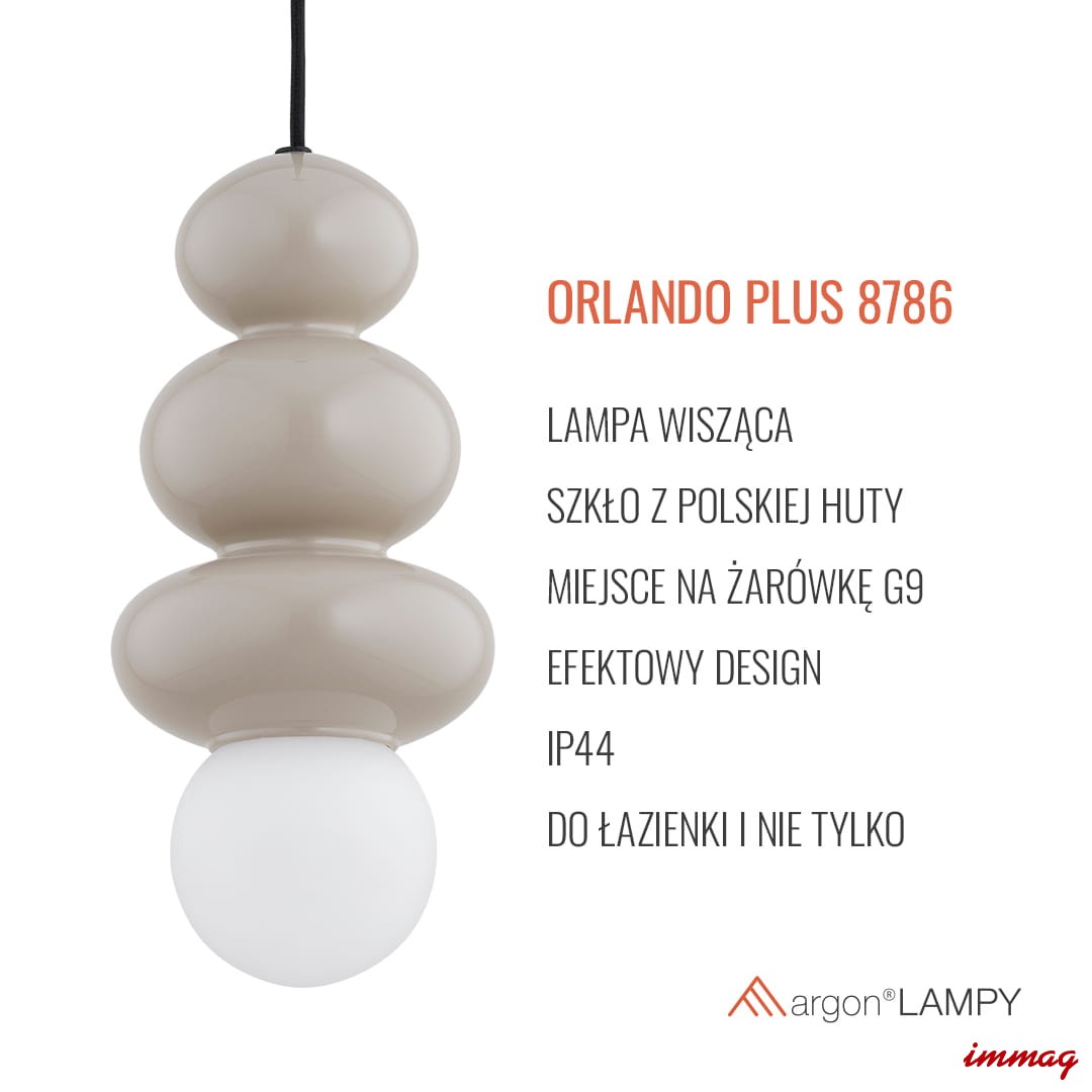 Efektowna lampa wisząca do łazienki? A może piękne zwieńczenie klatki schodowej? Nowoczesna lampa nad stolik kawowy? Lampa ORLANDO PLUS ma zastosowanie w licznych aranżacjach. Pozwól sobie na odrobinę świetlnego luksusu – postaw na szkło z polskiej huty, atrakcyjny wygląd i solidne wykonanie przez rzemieślników z manufaktury Argon spod Częstochowy. Orlando Plus to lampa o której można mówić bałwanek, albo stos kamieni, eliptyczne kształty szklanego klosza zostały połączone z klasyczną mleczną kulką, w której znalazło się miejsce na żarówkę G9. Dzięki zakryciu źródła światła lampa ma IP44, nadaje się więc także w pełni do łazienek. ORLANDO 8786 to lampa w kolorze kaszmiru w połączeniu z matową białą kulką. Kaszmir świetnie wpasuje się do łazienek i innych pomieszczeń gdzie będą dominowały kolory ziemi.
