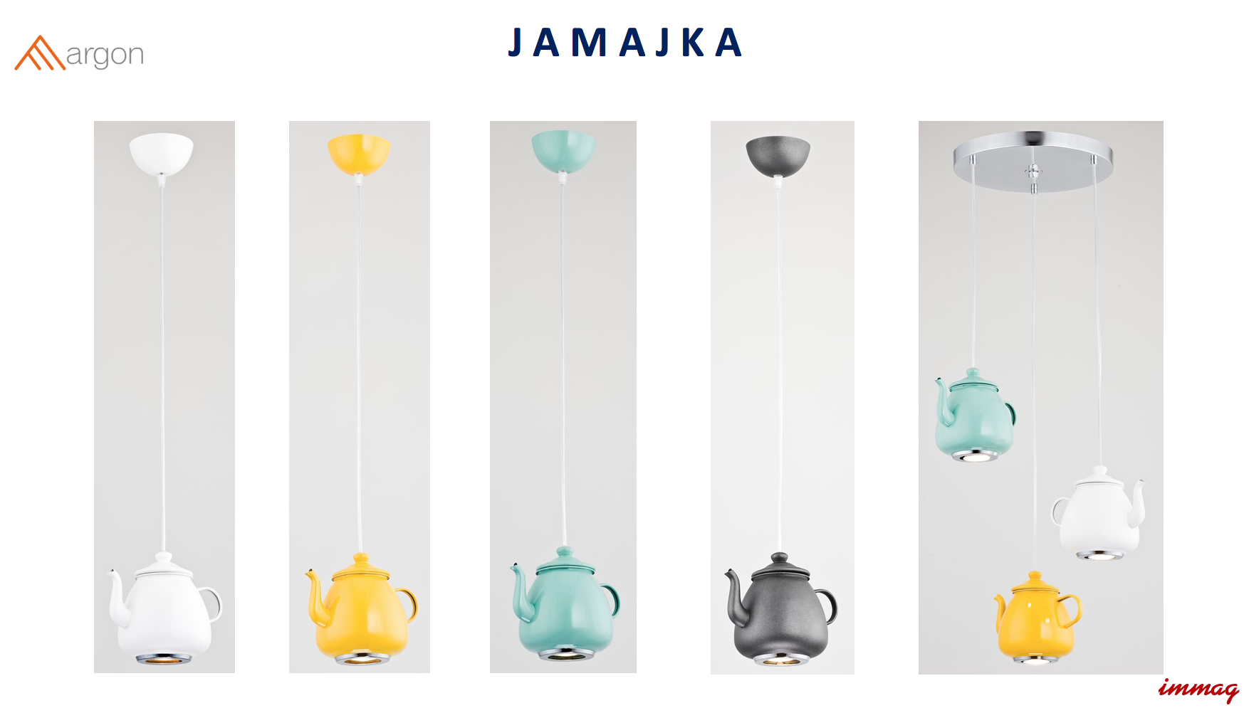 Rodzina Jamajka lamp firmy Argon. Klosze lamp jamajka stanowią kolorowe czajniczki. Możemy wybrać pojedyncze zwisy i rozwiesić je po pokoju, albo też wybrać zwis 3xGU10 gdzie czajniczki rozwieszone są na różnych wysokościach. Do dyspozycji mamy kolor miętowy, żółty, biały oraz antracyt. Lampa Jamajka może stanowić fantastyczną dekorację pastelowej kuchni, w innych miejscach zapewne również znajdzie wielu fanów. Produkt nie zawiera żarówek.