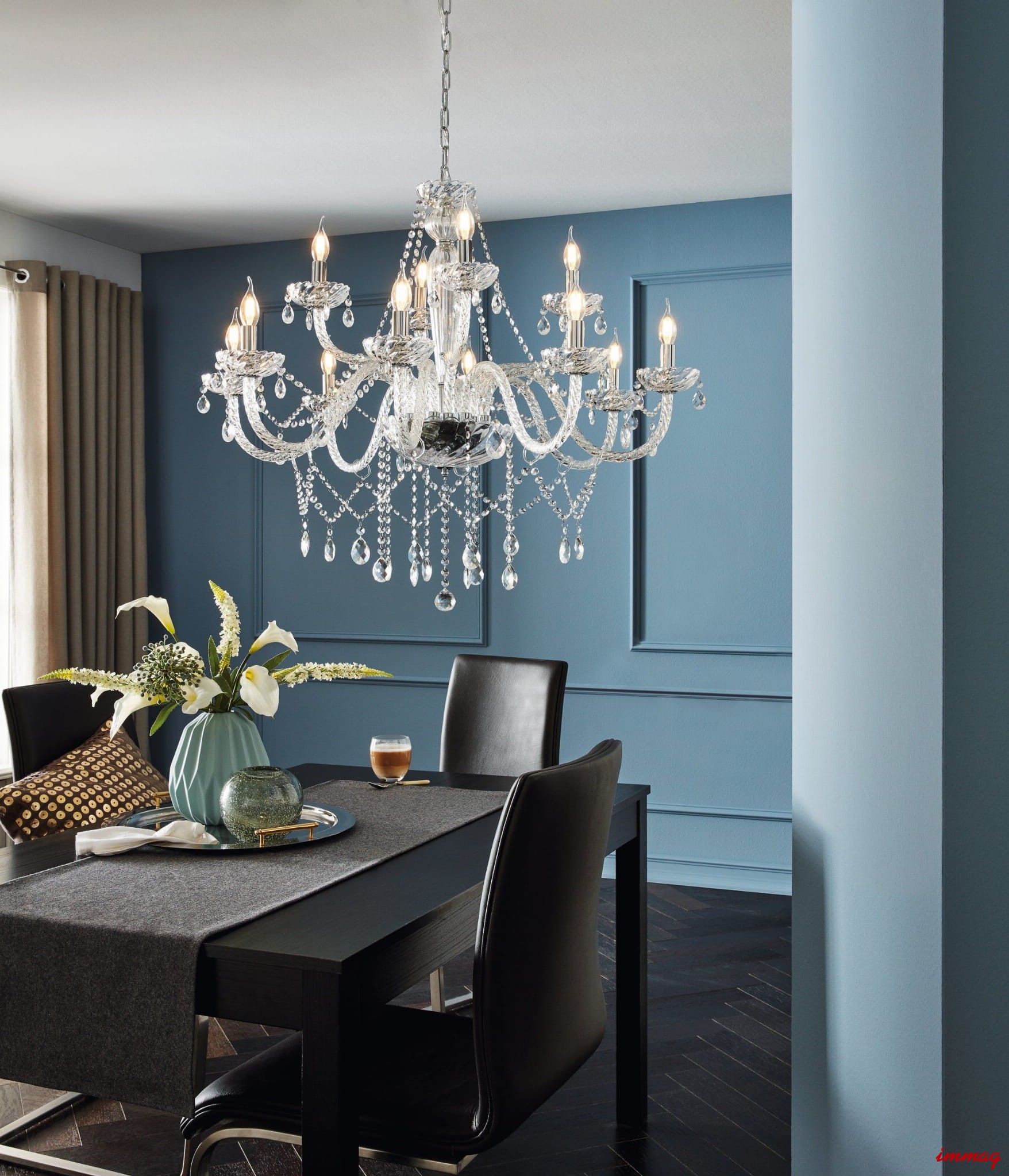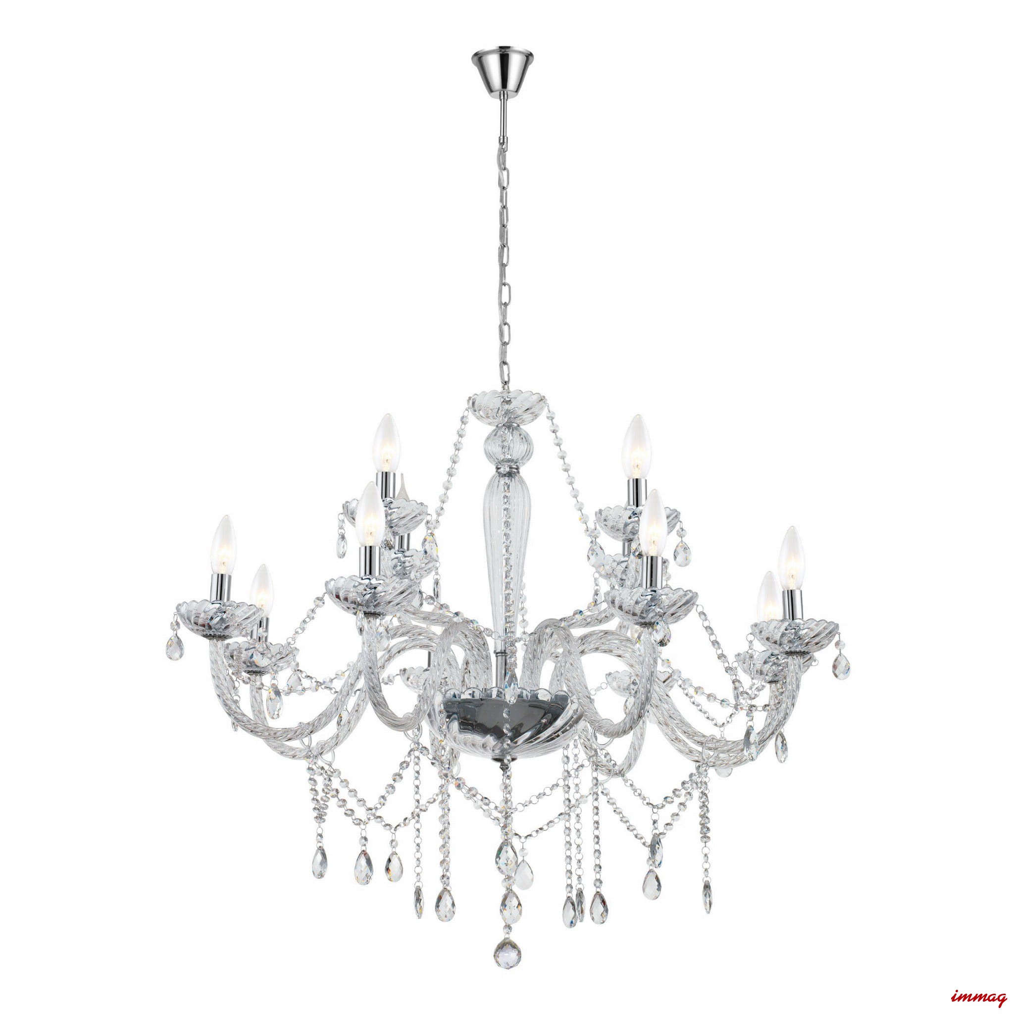 BASILANO i BASILANO 1 to kolekcja bogato zdobionych żyrandoli, wykonanych z połączenia szykownego chromu z pięknie połyskującym przeźroczystym lub koniakowym szkłem. Dekoracyjnie wygięte ramiona lampy, zakończone płaskim talerzykiem ozdobiono dużą ilością wiszących szklanych paciorków, które podkreślają ich bardzo wytworny, barokowy charakter. Szeroki wybór żyrandoli BASILANO pozwala dopasować je do każdego pomieszczenia począwszy od małych gościnnych pokoi po duże, przestronne salony.