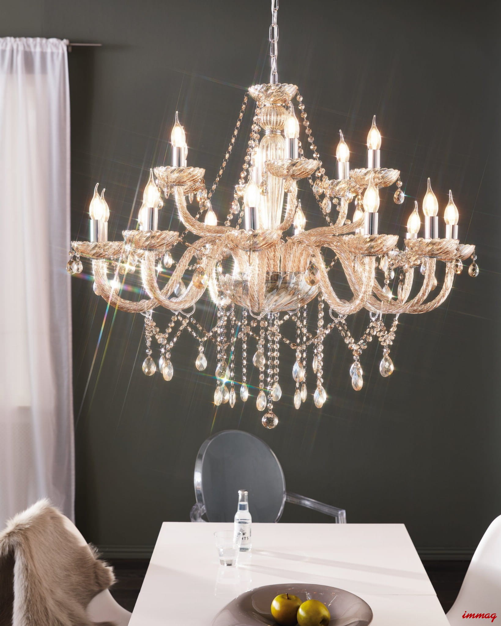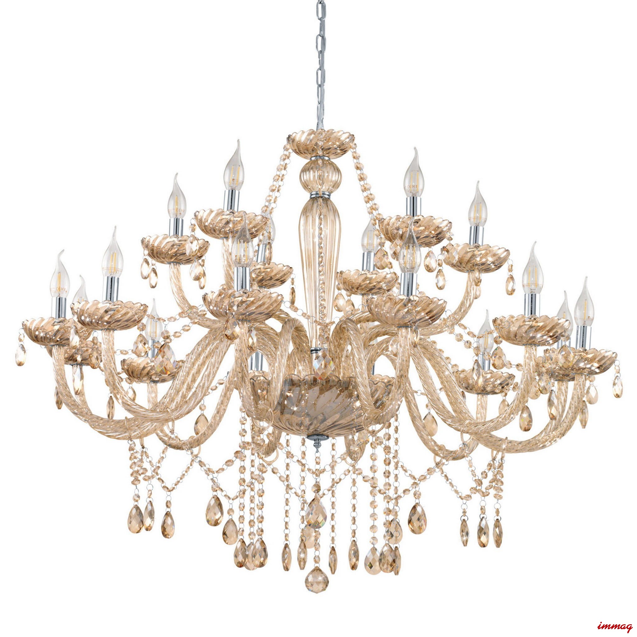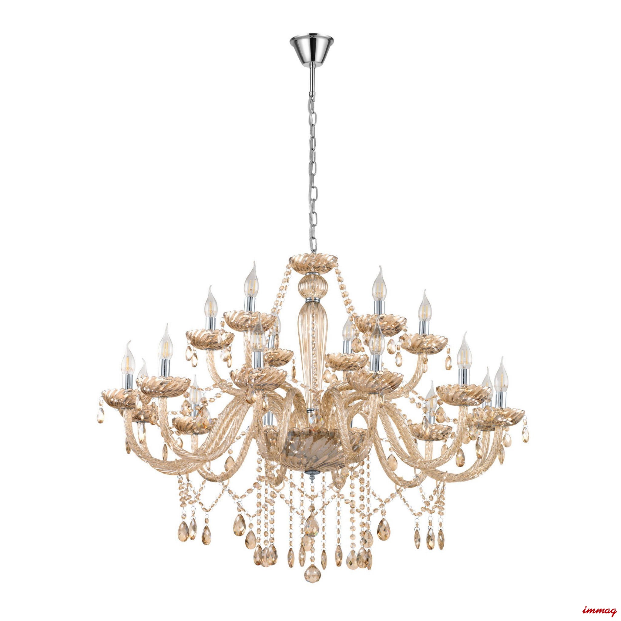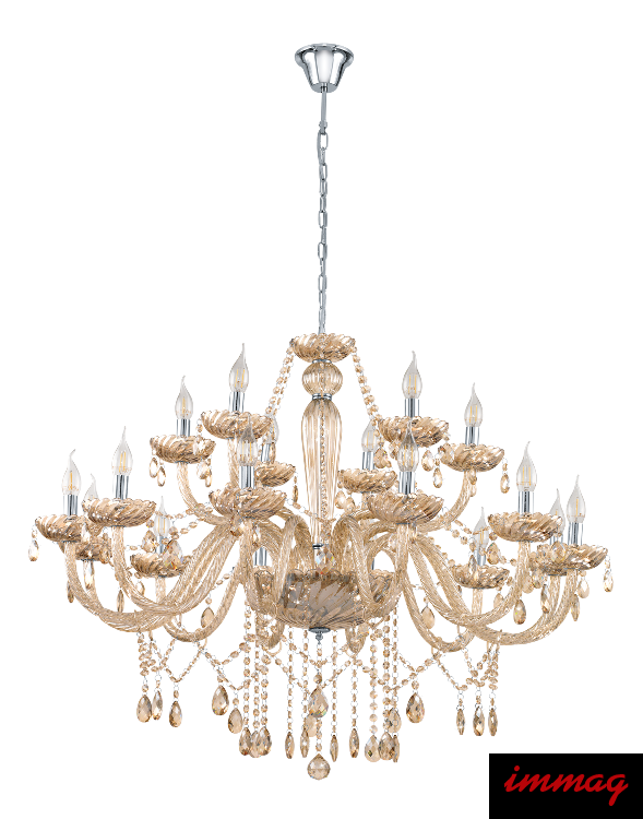 Basilano i Basilano 1 to kolekcja bogato zdobionych żyrandoli, wykonanych z połączenia szykownego chromu z pięknie połyskującym przeźroczystym lub koniakowym szkłem. Dekoracyjnie wygięte ramiona lampy, zakończone płaskim talerzykiem ozdobiono dużą ilością wiszących szklanych paciorków, które podkreślają ich bardzo wytworny, barokowy charakter. Szeroki wybór żyrandoli Basilano pozwala dopasować je do każdego pomieszczenia począwszy od małych gościnnych pokoi po duże, przestronne salony.