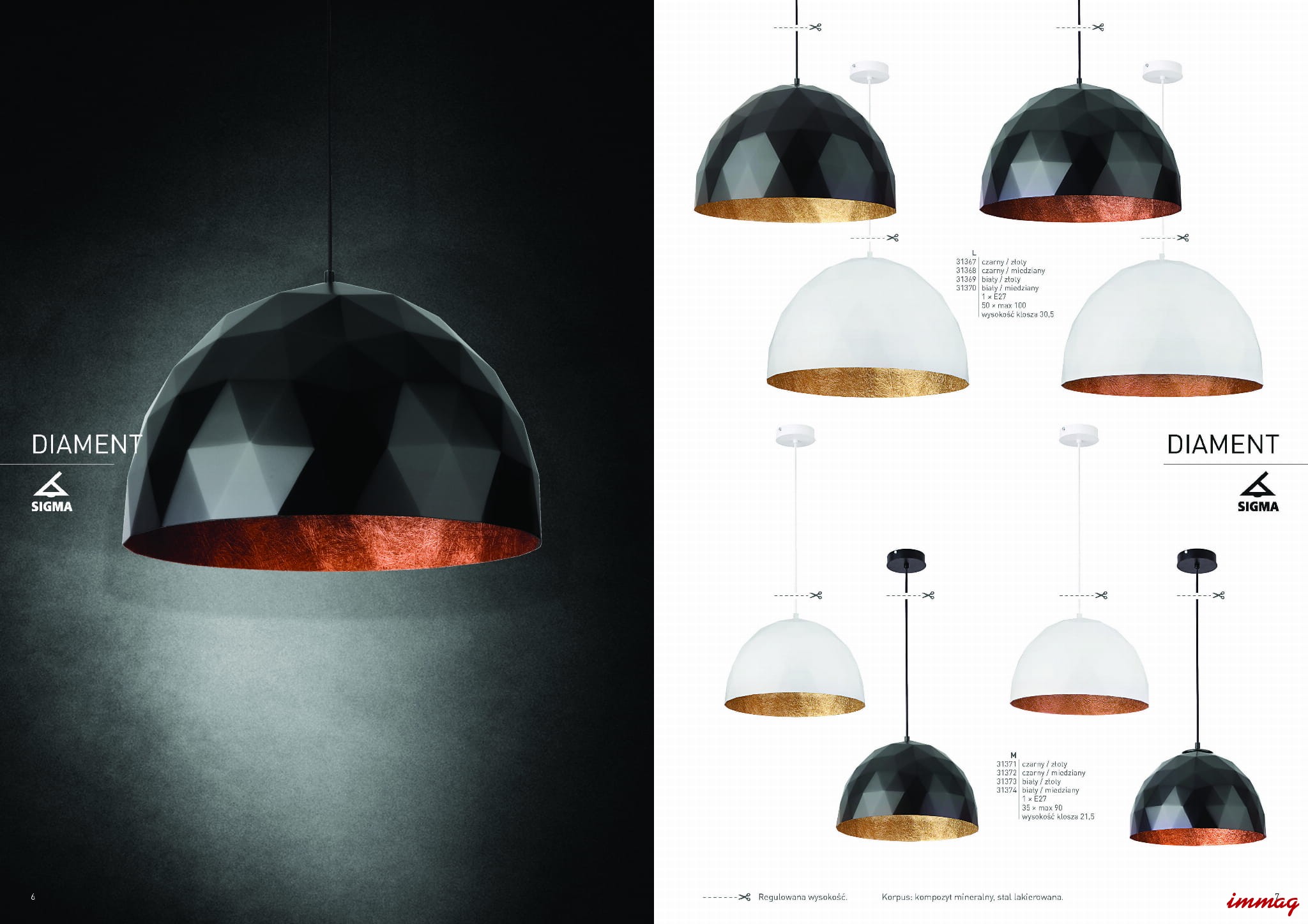 DIAMENT - seria lamp wiszących, o bardzo efektownym i przykuwającym uwagę kloszu. Jego zewnętrza część to ciekawie wyprofilowana wartstwa tworząca kształt trójkątów, natomiast wewnętrza, strukturalna w kolorze miedzi lub złota zapewnia niezwykłe rozproszenie światła. W ofercie lampy DIAMENT dostępne są w dwóch średnicach klosza: 500 mm lub 350 mm.