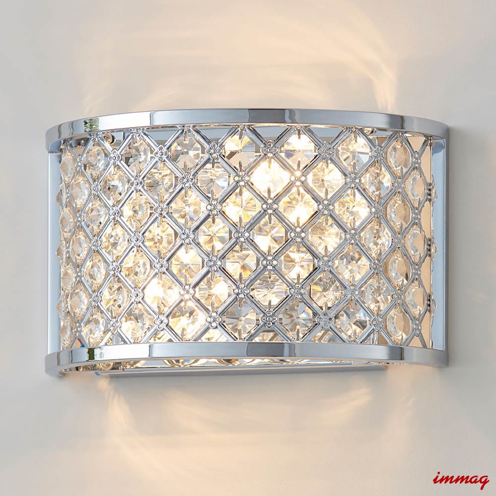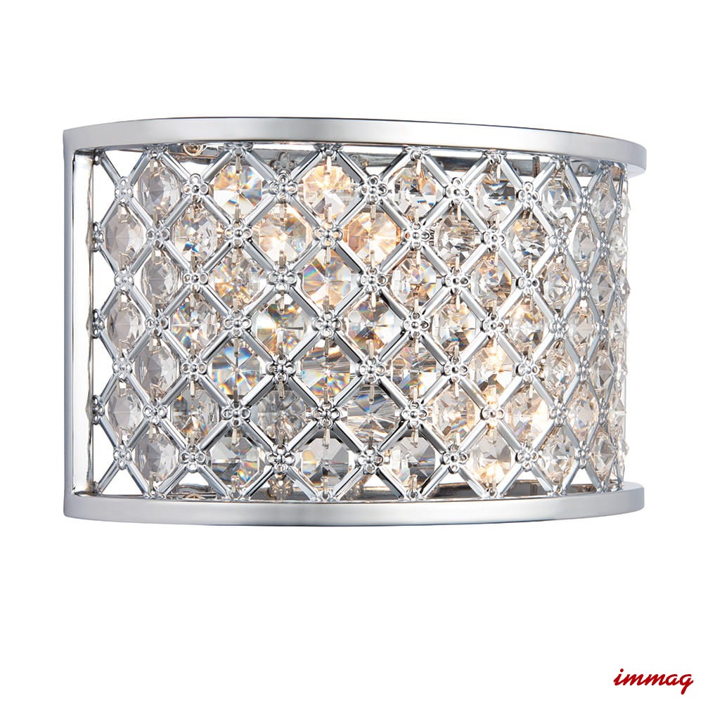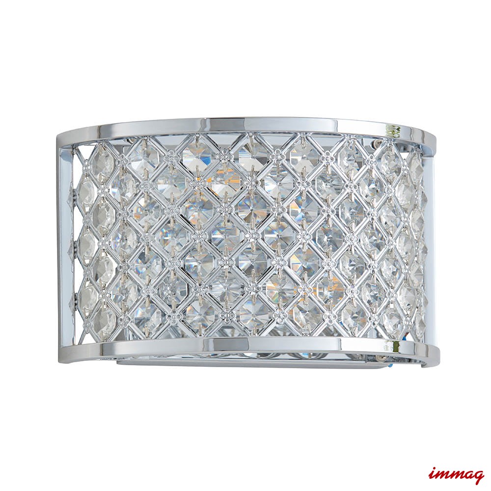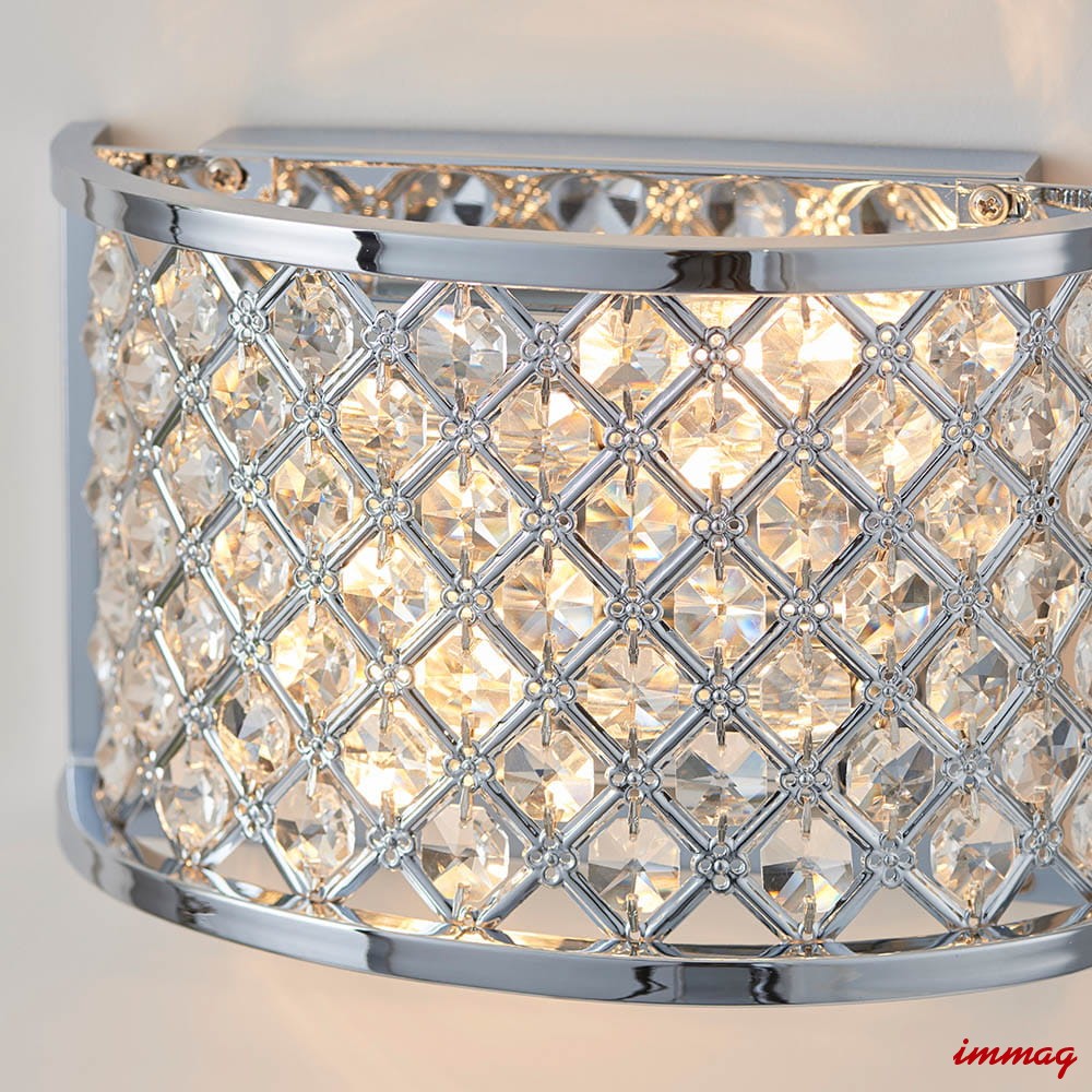 Dwupunktowa oprawa ścienna wykonana z kryształowych koralików osadzonych w stalowej ramie, wykończona polerowanym chromem. Ściemnialna i kompatybilna z żarówkami LED. Dostępne pasujące produkty. Możliwość ściemniania Chromowana płytka i przezroczyste szkło Wykonane ze stali i szkła kryształowego