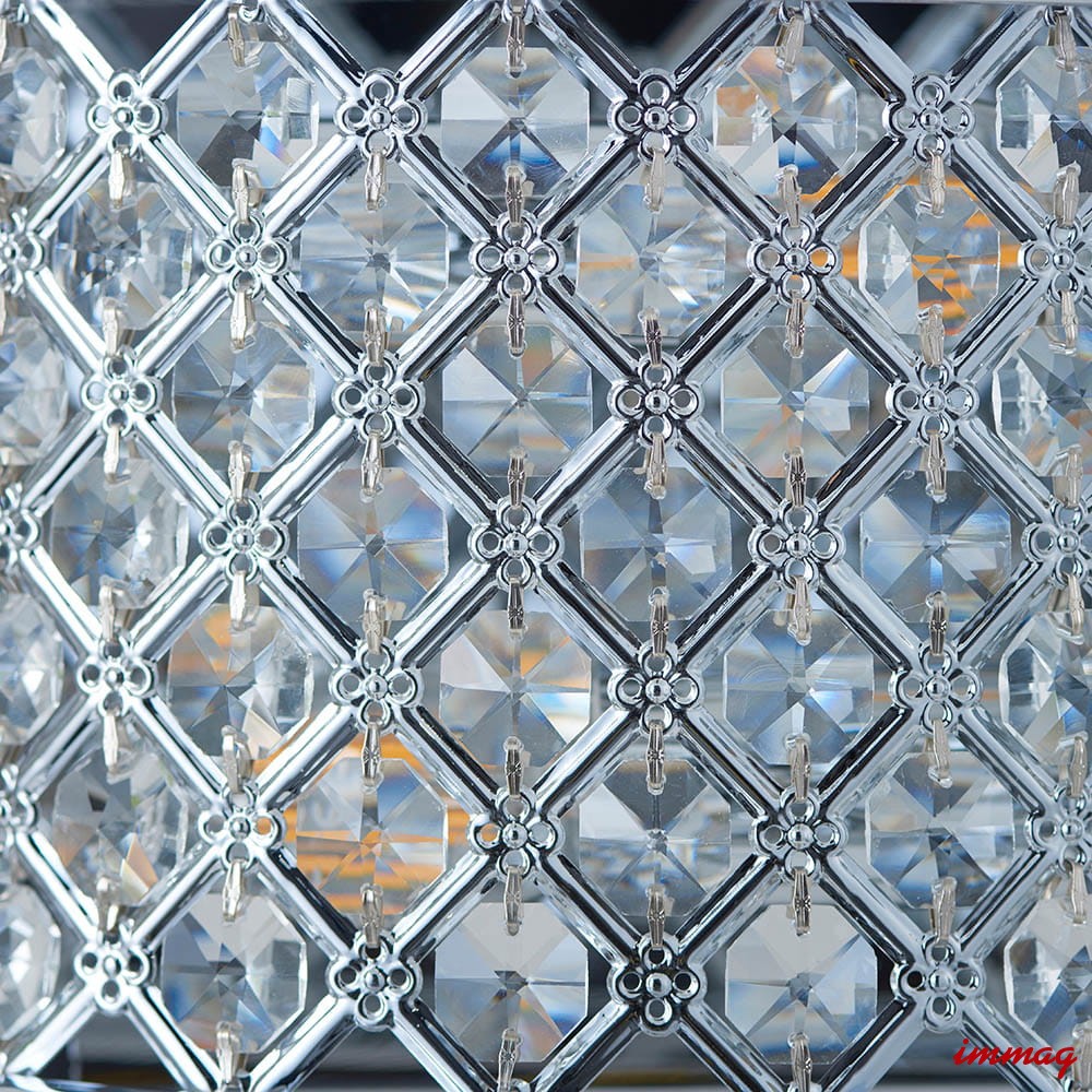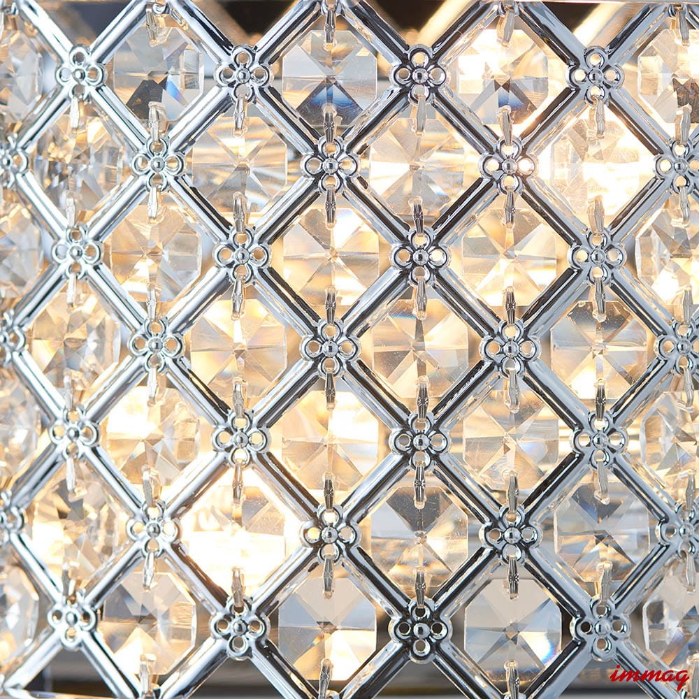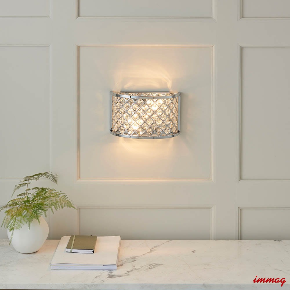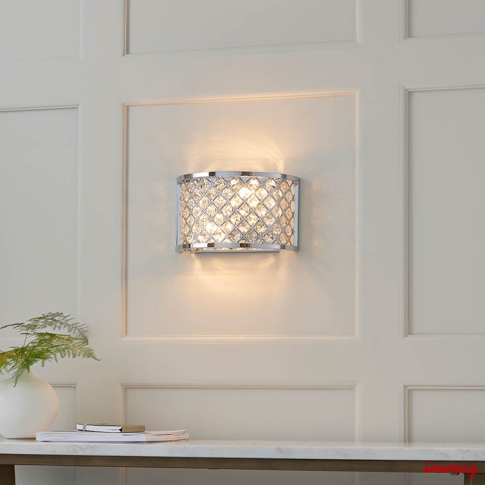 Dwupunktowa oprawa ścienna wykonana z kryształowych koralików osadzonych w stalowej ramie, wykończona polerowanym chromem. Ściemnialna i kompatybilna z żarówkami LED. Dostępne pasujące produkty. Możliwość ściemniania Chromowana płytka i przezroczyste szkło Wykonane ze stali i szkła kryształowego