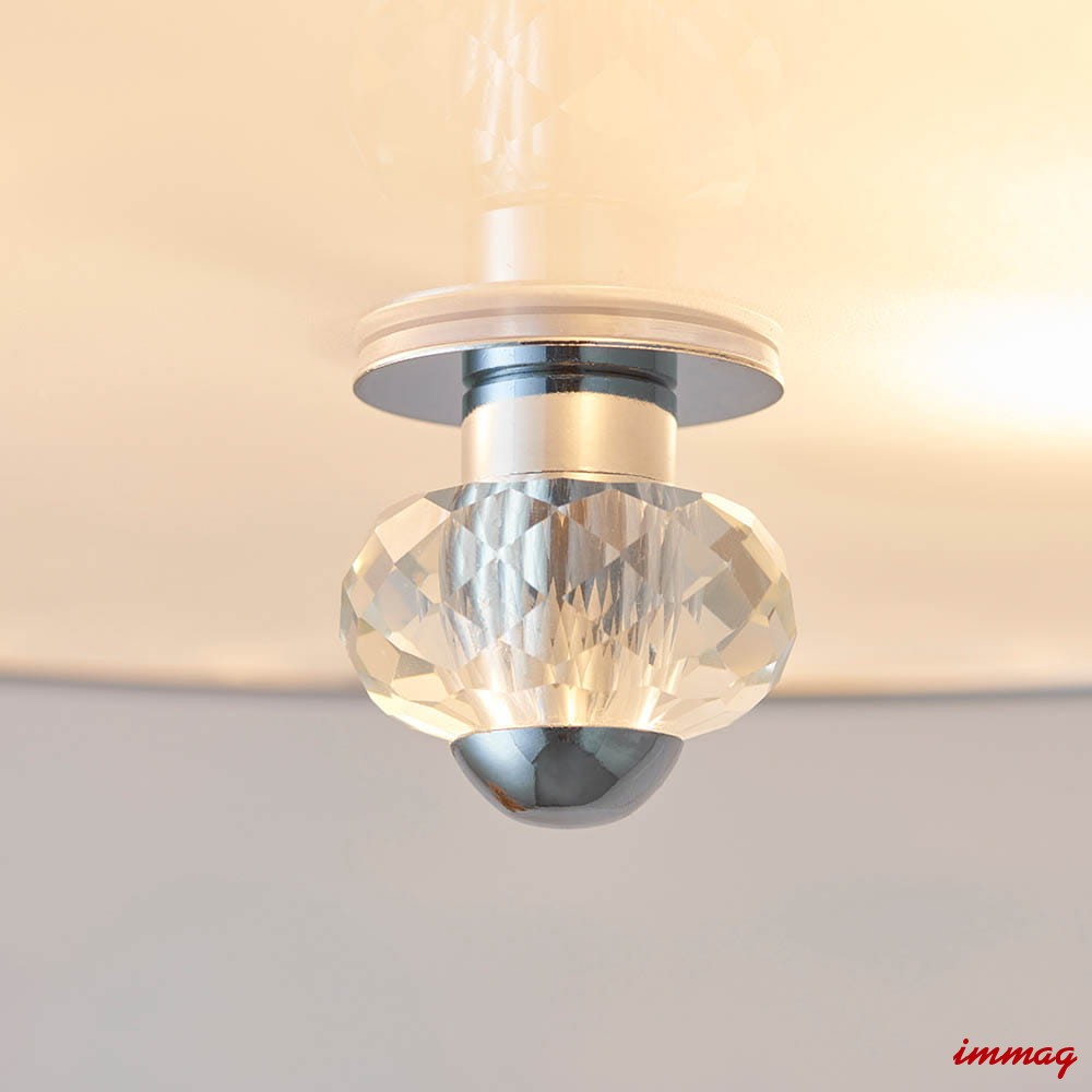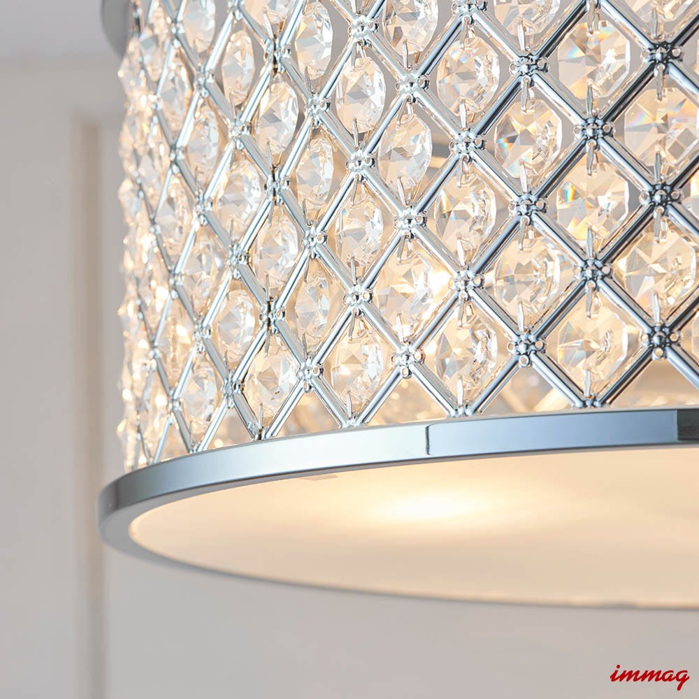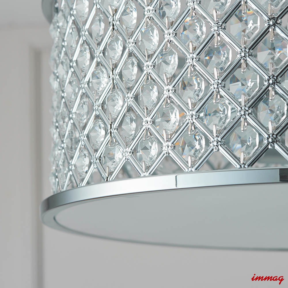 Lampa wisząca sufitowa z polerowanym chromowanym wykończeniem. Klosz wykonany jest z kryształowych koralików i opalowego dyfuzora u dołu. Lampa jest ściemnialna i nadaje się do stosowania z żarówkami LED. Dostępne są pasujące produkty.