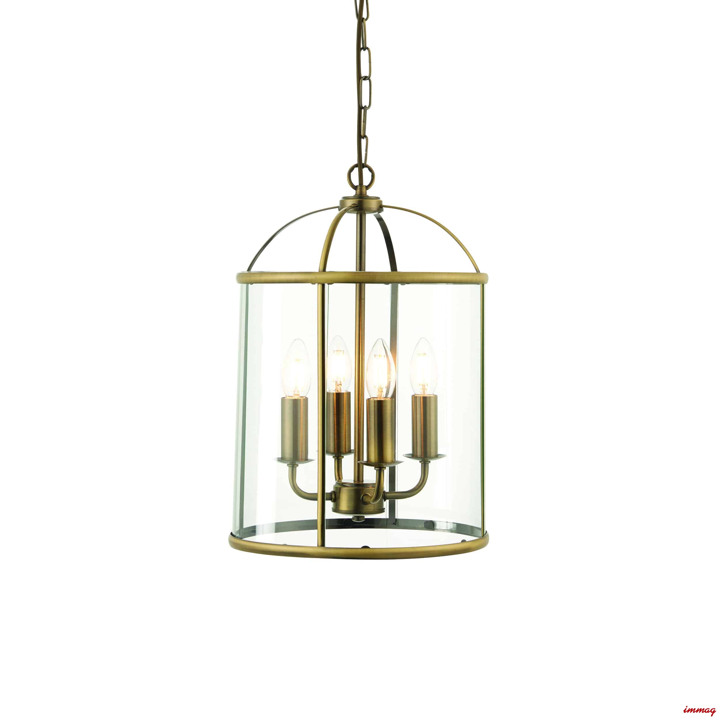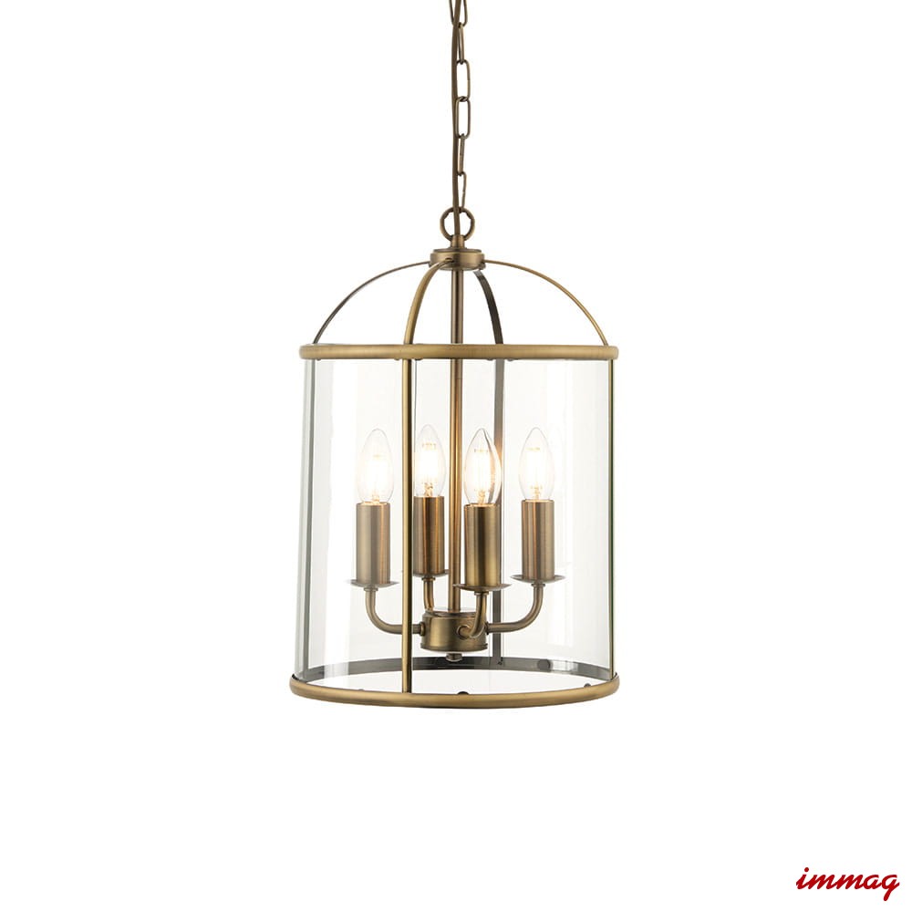 Lampa wisząca Lambeth z czterema żarówkami ma regulowaną długość i łączy metalową ramę z wykończeniem w kolorze antycznego mosiądzu oraz przezroczystymi szklanymi panelami. Nadaje się do stosowania z żarówkami LED i jest ściemnialna. Dostępne są również inne rozmiary i wykończenia.