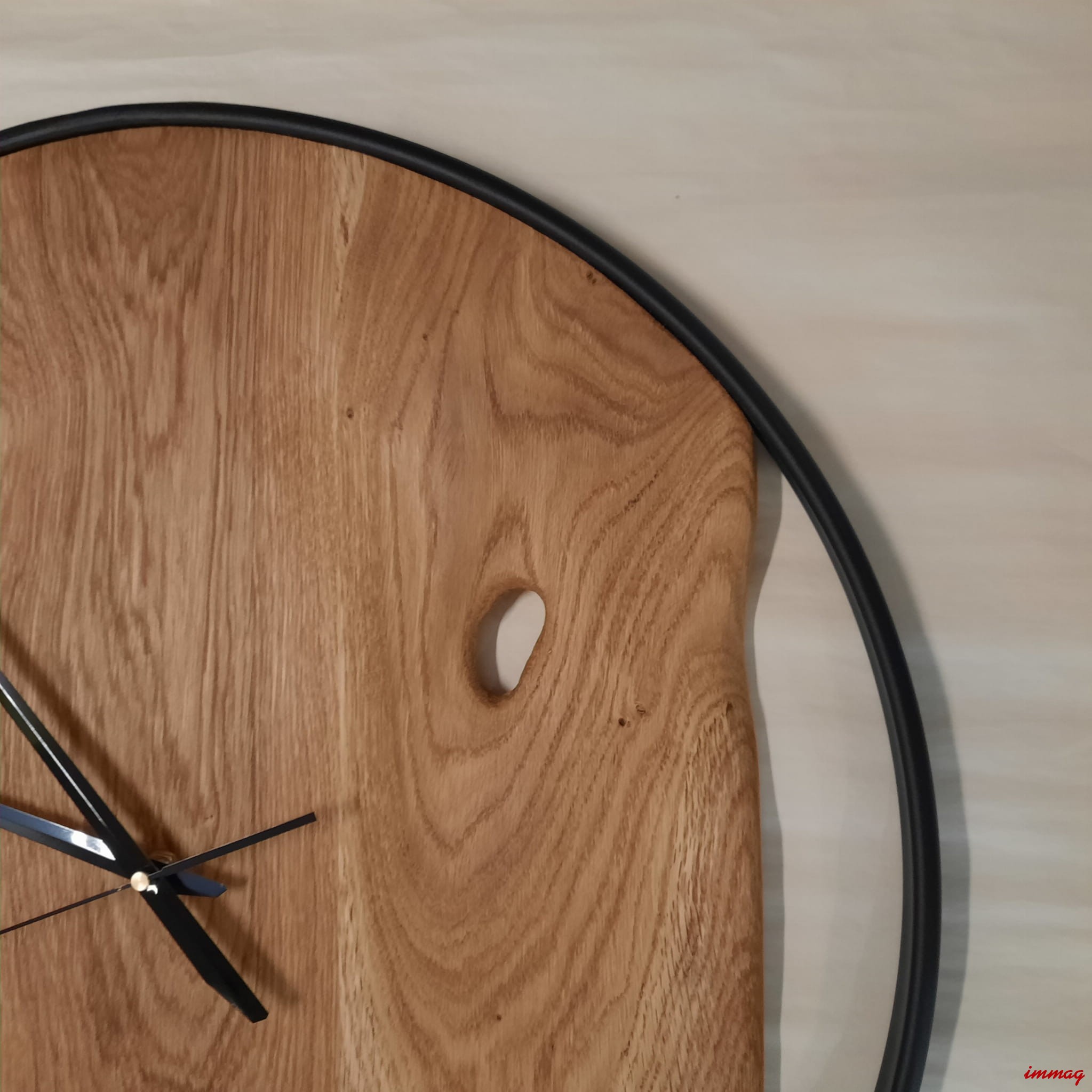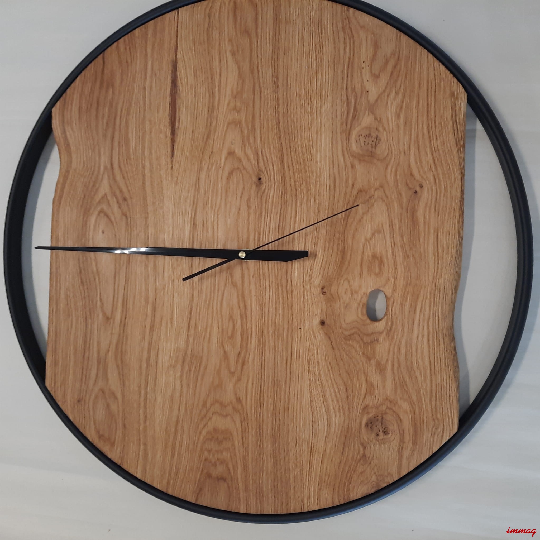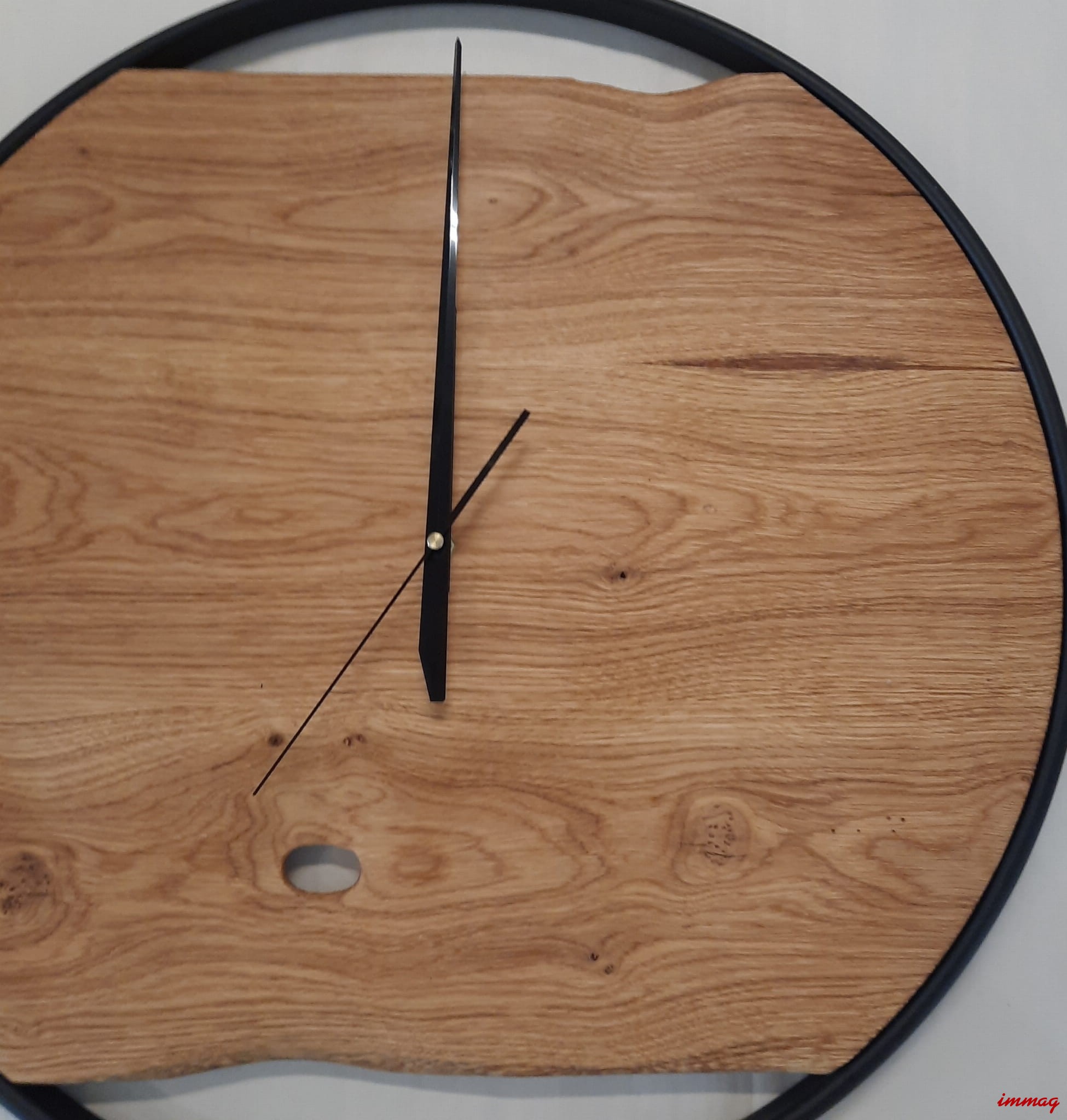 Zegar wykonany z deski dębowej ręcznie obrabianej i pokrytej olejem.