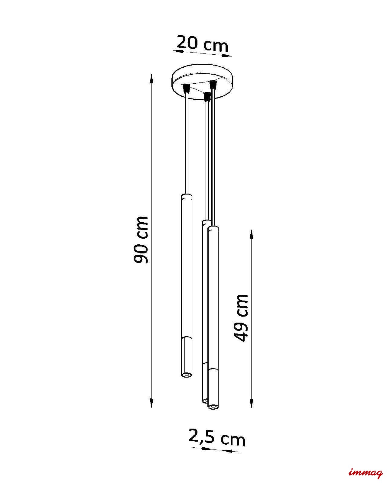 Wymiary: wysokość lampy 90cm , średnica klosza 2,5 cm , wysokość klosza 49cm, podsufitka średnica 20cm