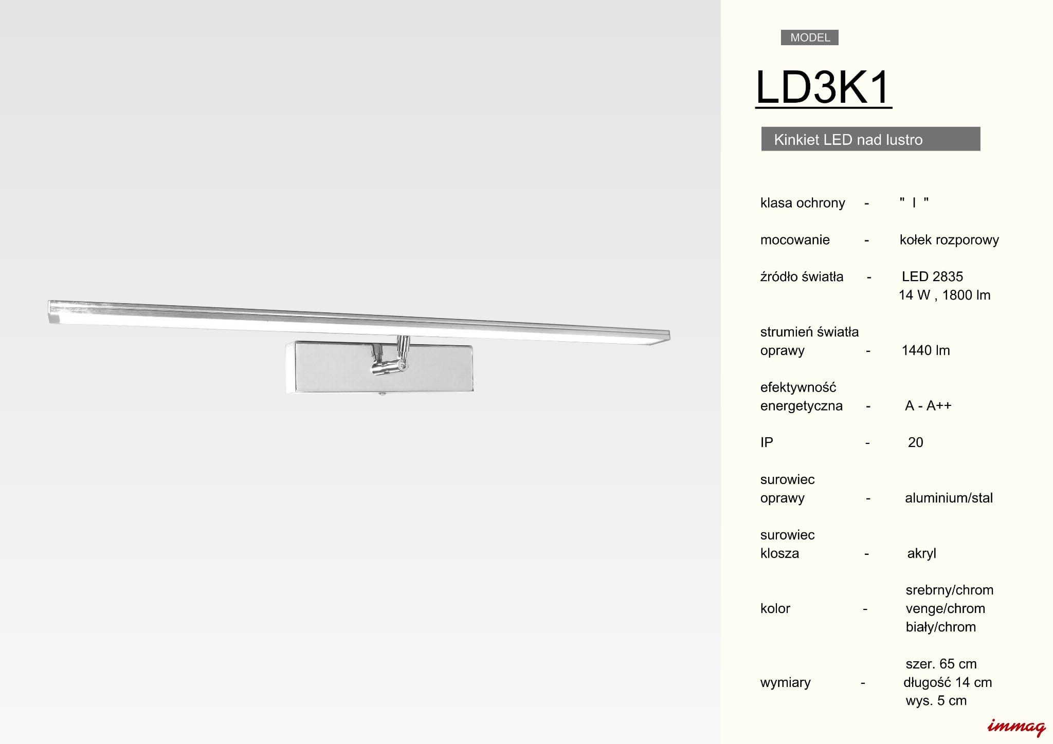 - Kinkiet obrazowy, nad obraz lub lustro regulowany 65cm 16W zintegrowany led LD3K1