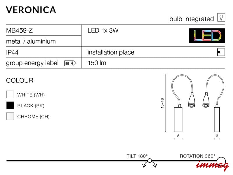 Bardzo praktyczna lampa ścienna ze zintegrowanym źródłem led, o przyjemnej barwie światła 3000K. Dzięki możliwości regulacji kinkiet idelnie nadaje sie do precyzyjnego oświetlenia wybranej powierzchni. Veronica dostepna jest w kolorze czarnym, białym i chromowym.