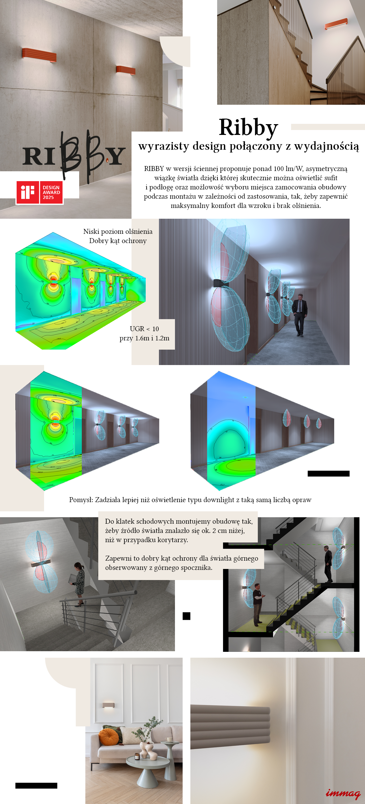 Kinkiet RIBBY oferuje trzy poziome moce: L, M i H, co pozwala na występowanie światła w przestrzeni – od subtelnego efektu dekoracyjnego, po funkcjonalnym oświetleniu komunikacyjnym. Konstrukcja pozwala na dostosowanie wysokości montażu do zastosowania, bez utraty funkcjonalności wizualnej. W projektach hotelowych, biurowych i wielorodzinnych warto zastosować po wersji H – zapewnia wymagany poziom światła w korytarzach bez zastosowania downlightów.