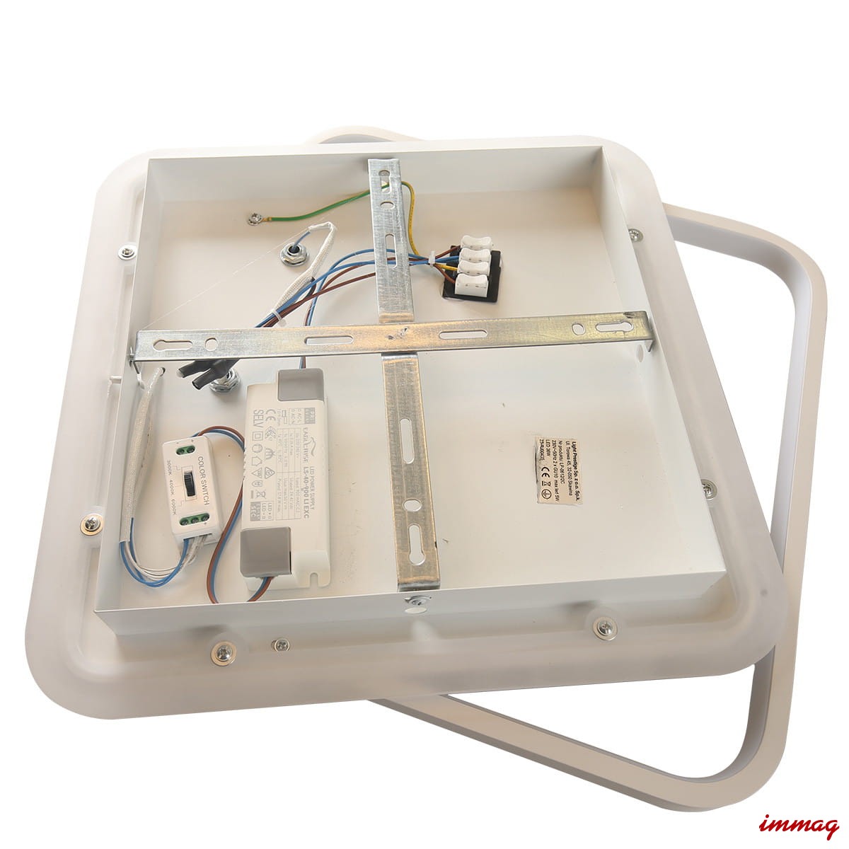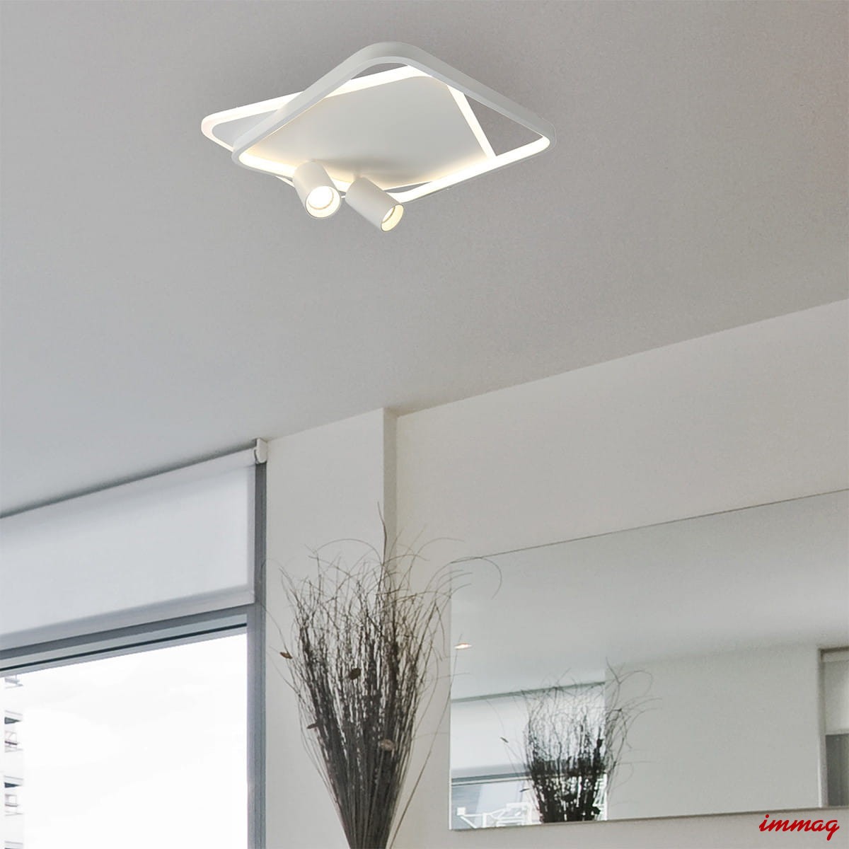 Plafon Parma 2 został wykonany z białego metalu oraz akrylu. Posiada dwa ruchome reflektorki z wymiennymi obręczami, do wyboru mamy białe lub złote obręcze (obie wersje znajdują się w zestawie). Regulacja kąta nachylenia reflektorków sprawia, że można ustawić kierunek padania światła dokładnie w wymaganym kierunku, np. na biurko. Plafon posiada miejsce na żarówki o gwincie GU10 oraz wbudowane światło LED o zmiennej barwie światła CCT, co oznacza że można ustawić dowolną barwę światła LED od ciepłej poprzez neutralną, aż po zimną. Barwę światła ustawia się przed montażem w podsufitce lampy.
