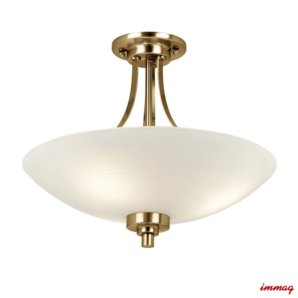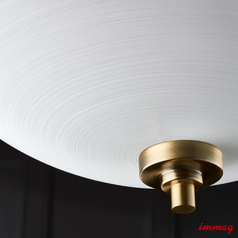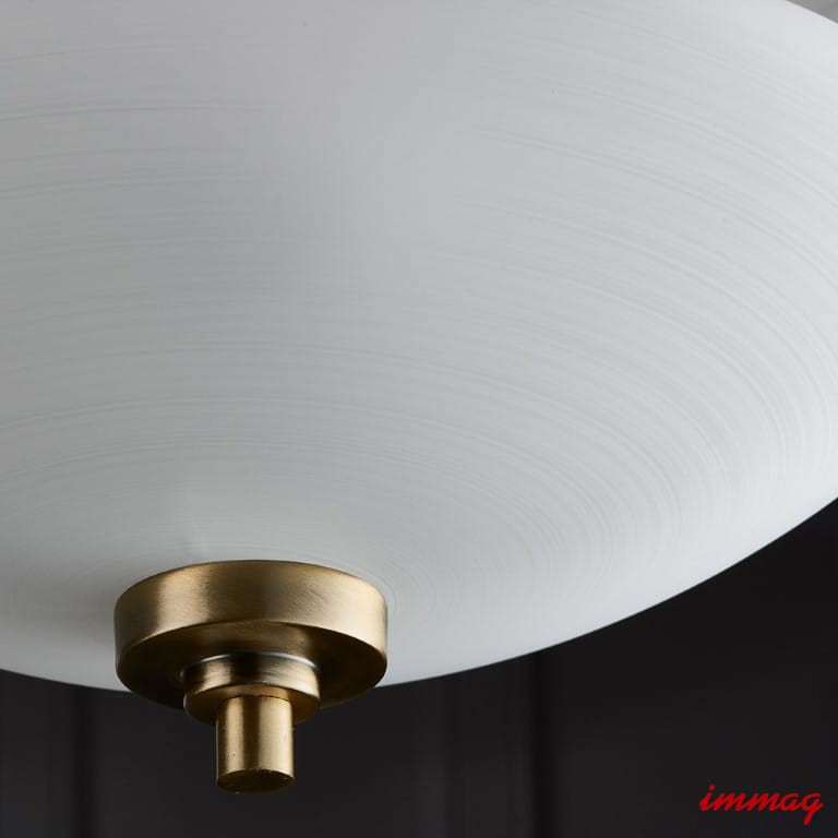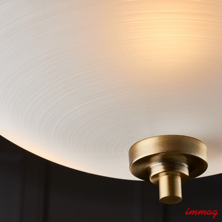 Półpłaska lampa Welles ma wykończenie w kolorze antycznego mosiądzu i klosz z białego, malowanego szkła o delikatnym wzorze linii. Dostępne są również inne wykończenia i pasujące elementy, wszystkie kompatybilne z żarówkami LED i ściemnialne.