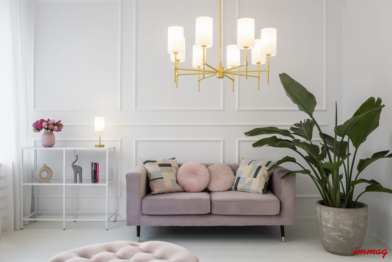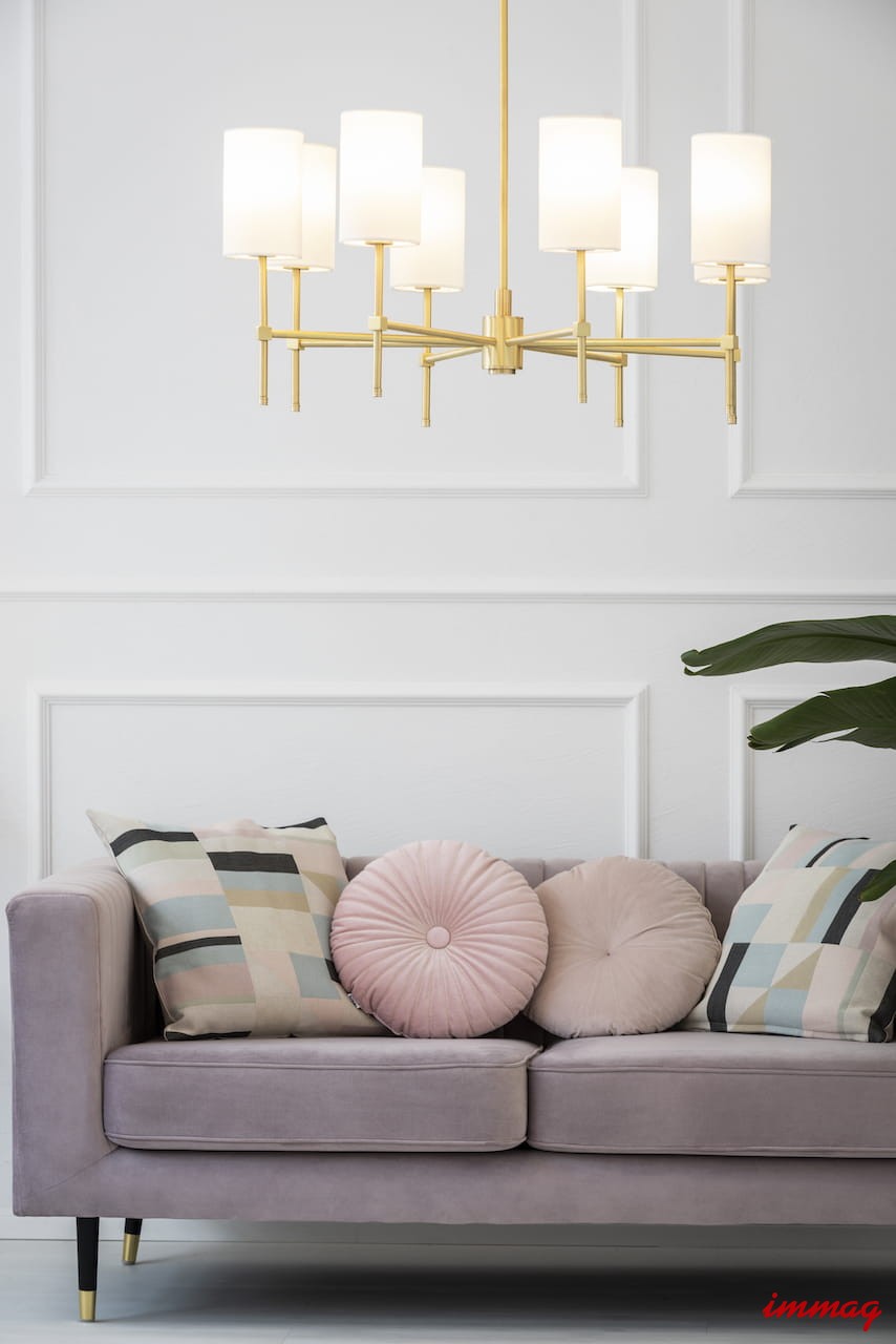 Rodzina lamp Abruzzo wykonana z mosiądzu szczotkowanego i welurowe abażurki. Wykończone z niezwykłą starannością lampy mają w swojej rodzinie żyrandole wiszace na na 5 i 8 żarówek, lampy gabinetowe i kinkiety. Rozświetlą każde wnętrze nadając mu ciepłego klimatu.