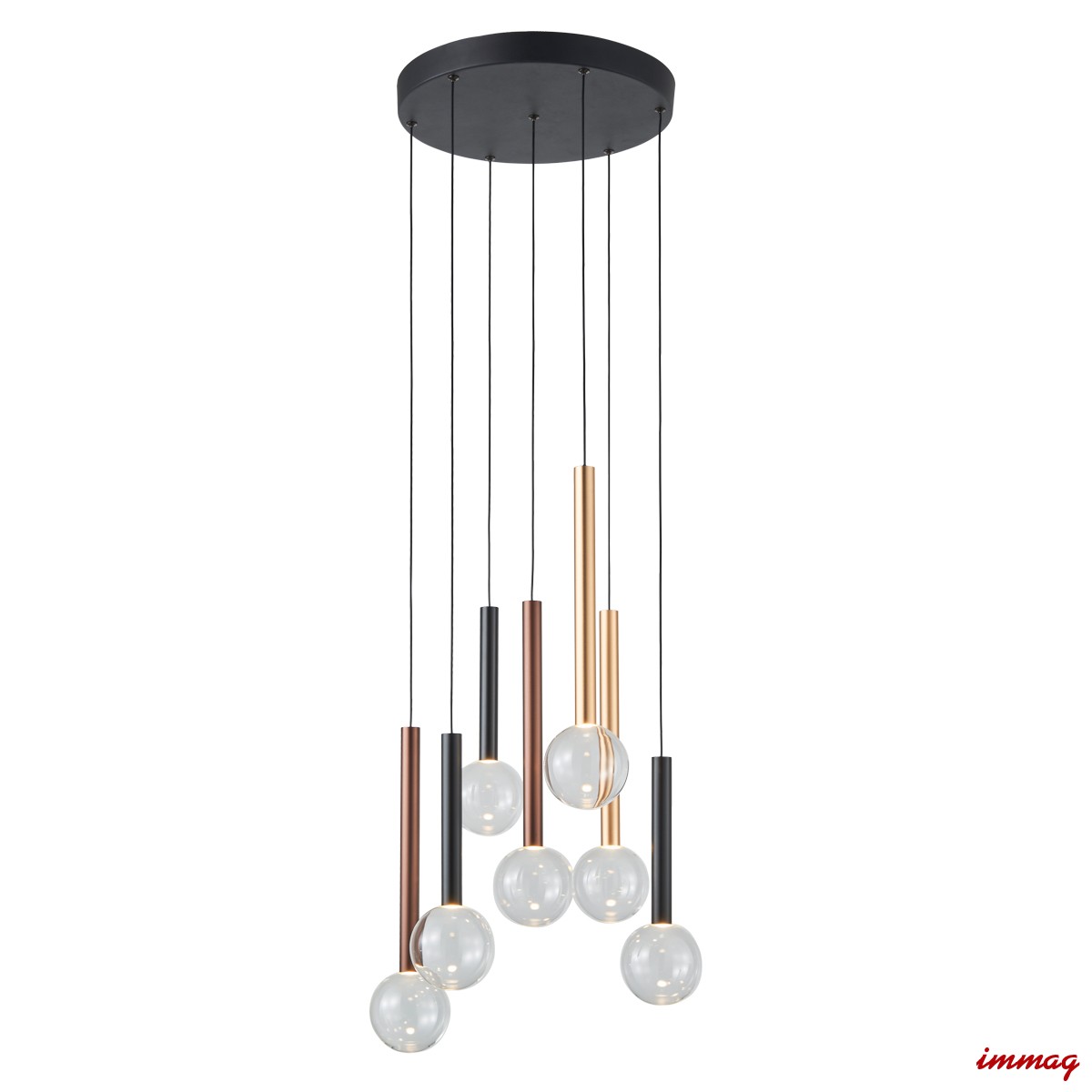 Nowoczesna lampa wiszące ze zintegrowanym źródłem LED. Klosze w formie metalowej tuby w kolorze czarnym 3 sztuki, złotym i miedzianym po 2 sztuki na dole zakończone szklaną kulą. Możliwość regulowania wysokości. Ściemnianie sekwencyjne klawiszem na ścianie.