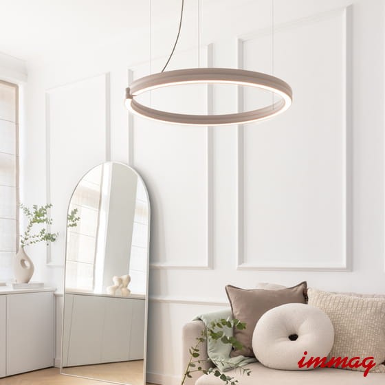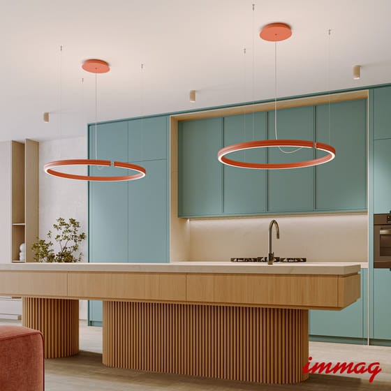 RIBBY circle to zwieszane oprawy LED o dwukierunkowej emisji światła, dostępne w różnych rozmiarach, oraz o różnych mocach. Świetnie sprawdzają się nad stołem, wyspą kuchenną, ladą recepcyjną czy w wysokich przestrzeniach wspólnych. Dzięki swojej konstrukcji RIBBY pozwala doświetlić strefę roboczą i jednocześnie wprowadza przyjemne, rozproszone światło ogólne, odbite od jasnego sufitu. W większych przestrzeniach zastosuj kilka opraw RIBBY o różnych średnicach i zawieś je na różnych wysokościach – uzyskasz atrakcyjny efekt głębi i architektonicznej lekkości. Dodatkowym atutem jest możliwość doboru odpowiedniej barwy światła: 2700K lub 3000K do wyboru i też moce lampy L, M i H .