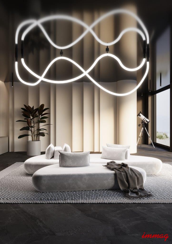 Rodzina lamp Hebi element świetlny wykonany z białego, satynowego silikonu. Mocowania wykonane są z aluminium malowanego na kolor w czarnej strukturze. Dwie długości 3,2m i 4,2m i hak do upięcia, pozwolą stworzyć ciekawą kompozycję. są w wersji natynkowa i podtynkowa oraz barwie światła 3000K lub 4000K. Dają światło rozproszone i ciekawą aranżację wnętrza.