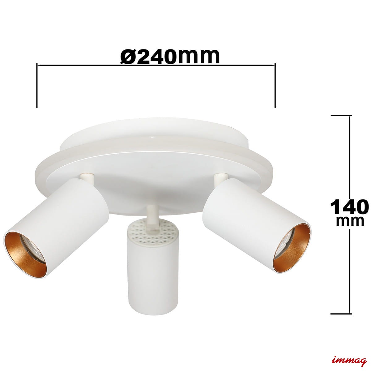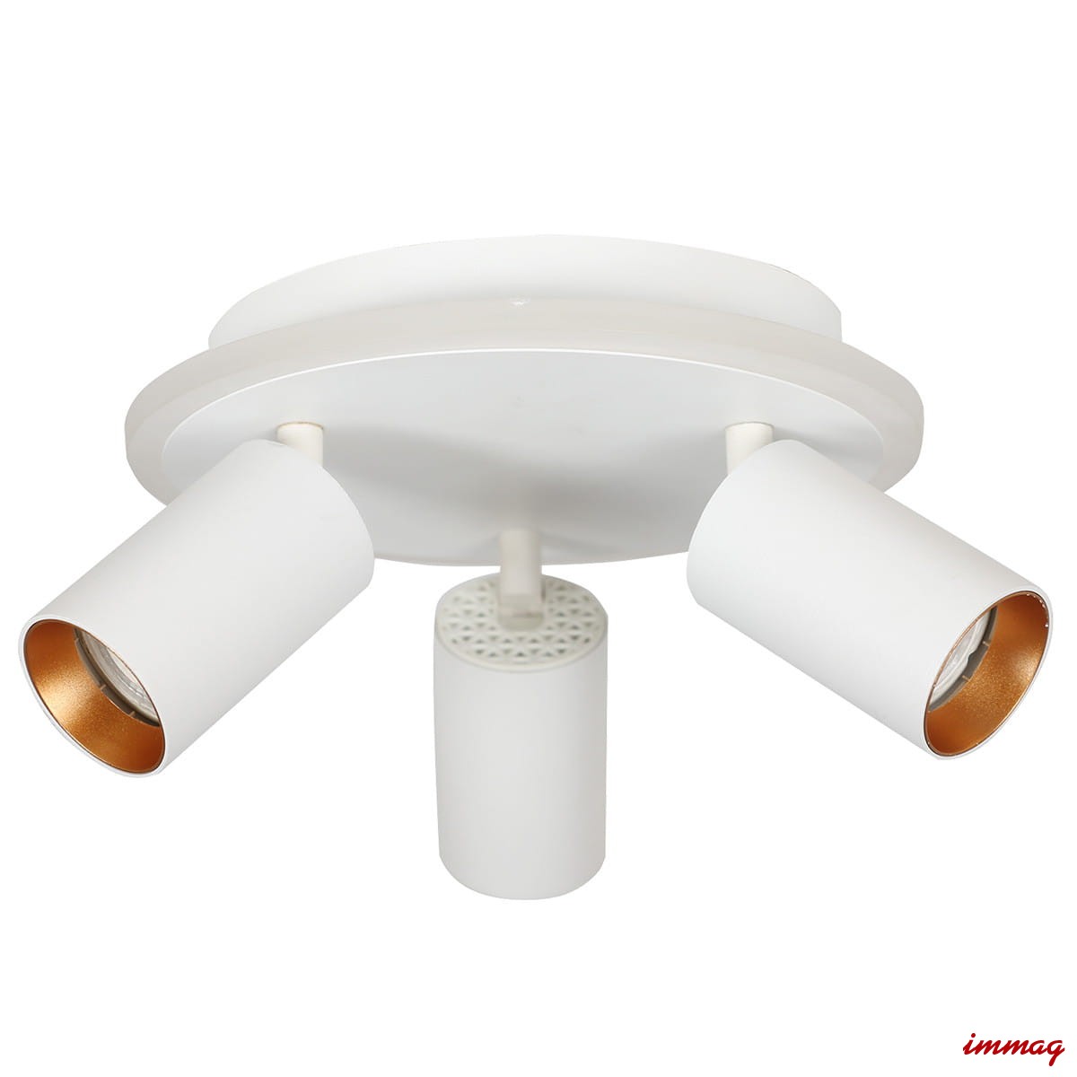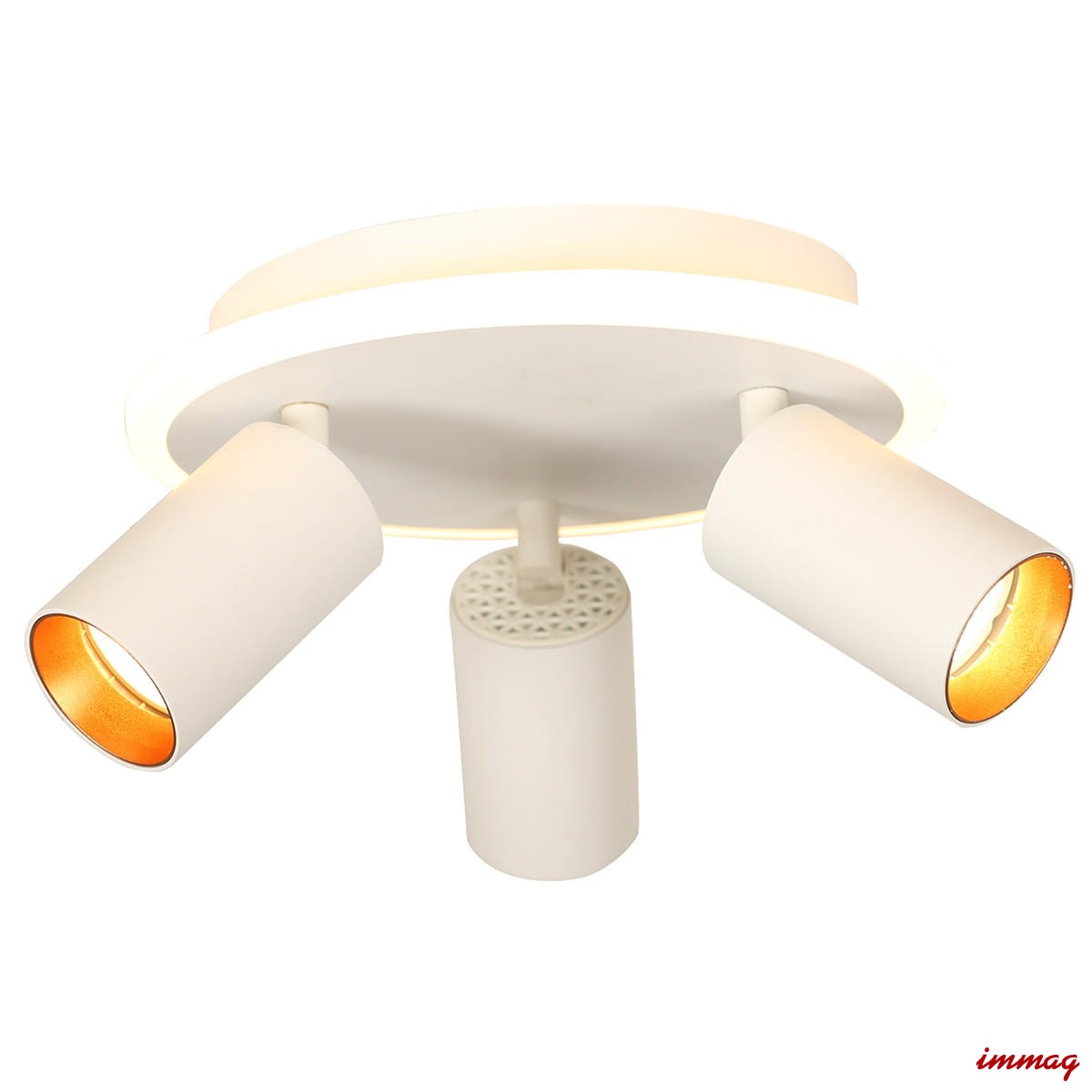 Plafon Parma 3 został wykonany z białego metalu. Posiada trzy ruchome reflektorki z wymiennymi obręczami, do wyboru mamy białe lub złote obręcze (obie wersje znajdują się w zestawie). Regulacja kąta nachylenia reflektorków sprawia, że można ustawić kierunek padania światła dokładnie w wymaganym kierunku, np. na biurko. Plafon posiada miejsce na żarówki o gwincie GU10 oraz wbudowane światło LED o zmiennej barwie światła CCT, co oznacza że można ustawić dowolną barwę światła LED od ciepłej poprzez neutralną, aż po zimną. Barwę światła ustawia się przed montażem w podsufitce lampy.