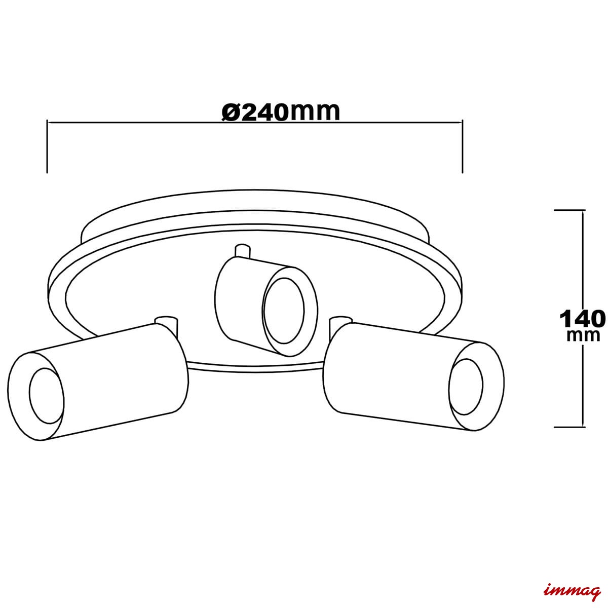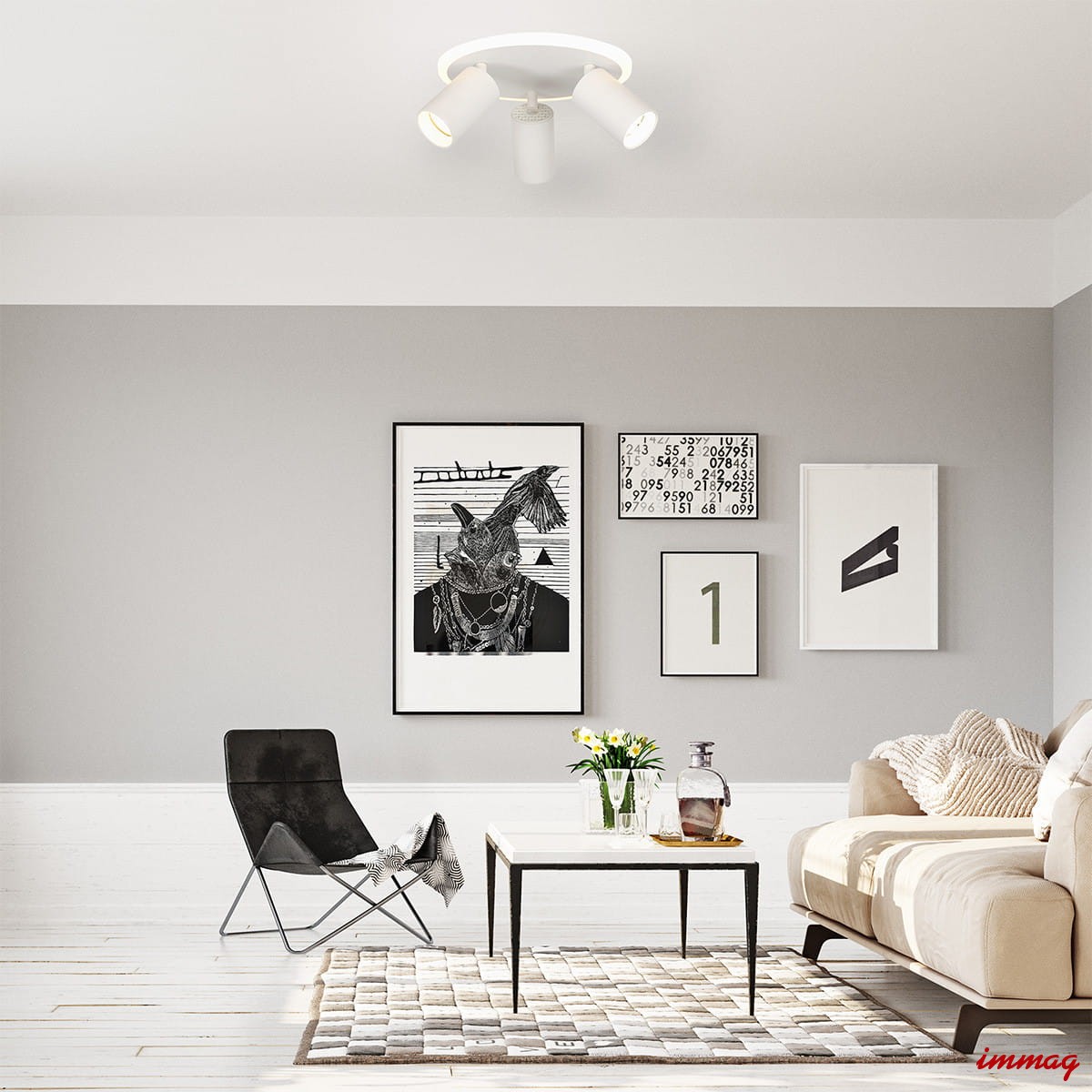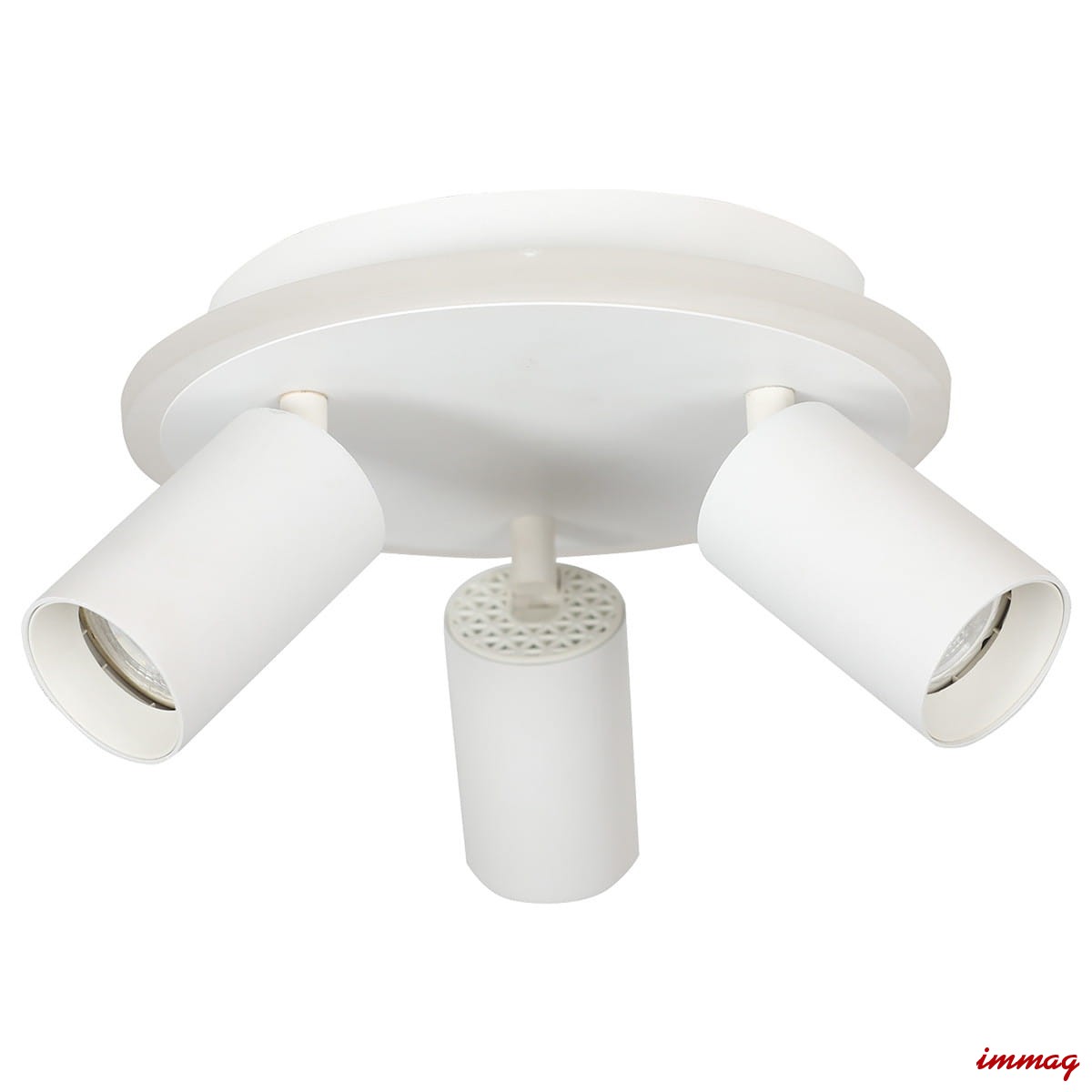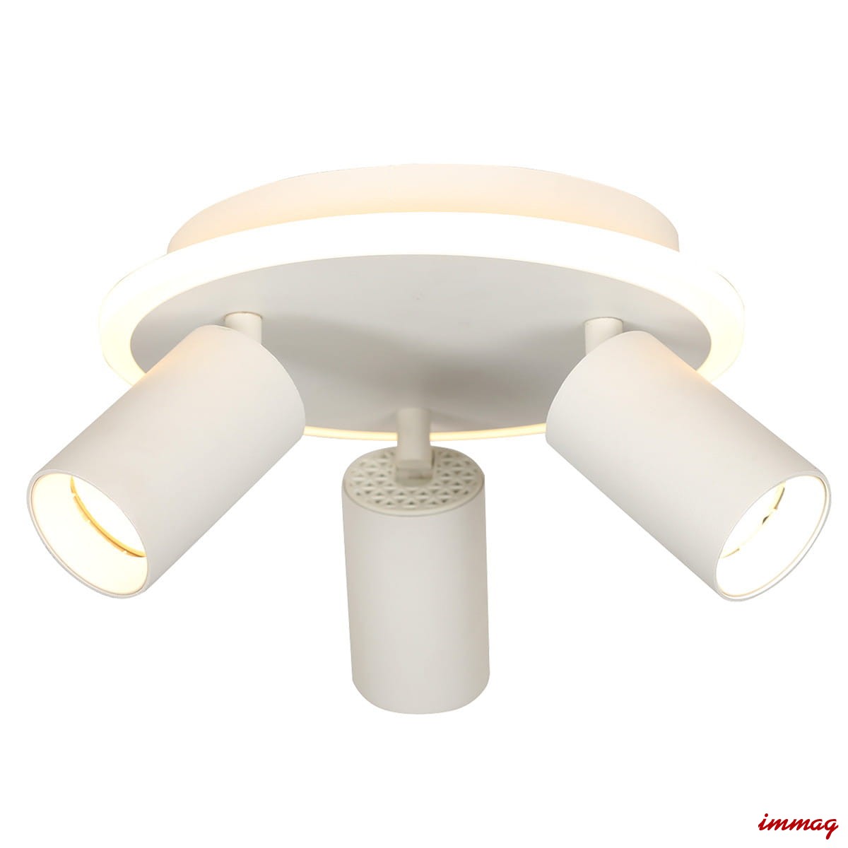 Plafon Parma 3 został wykonany z białego metalu. Posiada trzy ruchome reflektorki z wymiennymi obręczami, do wyboru mamy białe lub złote obręcze (obie wersje znajdują się w zestawie). Regulacja kąta nachylenia reflektorków sprawia, że można ustawić kierunek padania światła dokładnie w wymaganym kierunku, np. na biurko. Plafon posiada miejsce na żarówki o gwincie GU10 oraz wbudowane światło LED o zmiennej barwie światła CCT, co oznacza że można ustawić dowolną barwę światła LED od ciepłej poprzez neutralną, aż po zimną. Barwę światła ustawia się przed montażem w podsufitce lampy.