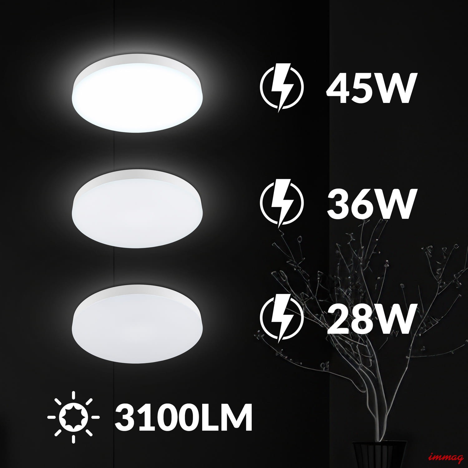 Dostosuj intensywność oświetlenia do wielkości i przeznaczenia wnętrza. Dzięki mocy od 28 W (do mniejszych pokoi) po 45 W (do otwartych salonów) osiągniesz optymalny strumień świetlny do 3900 lm, oszczędzając jednocześnie energię.