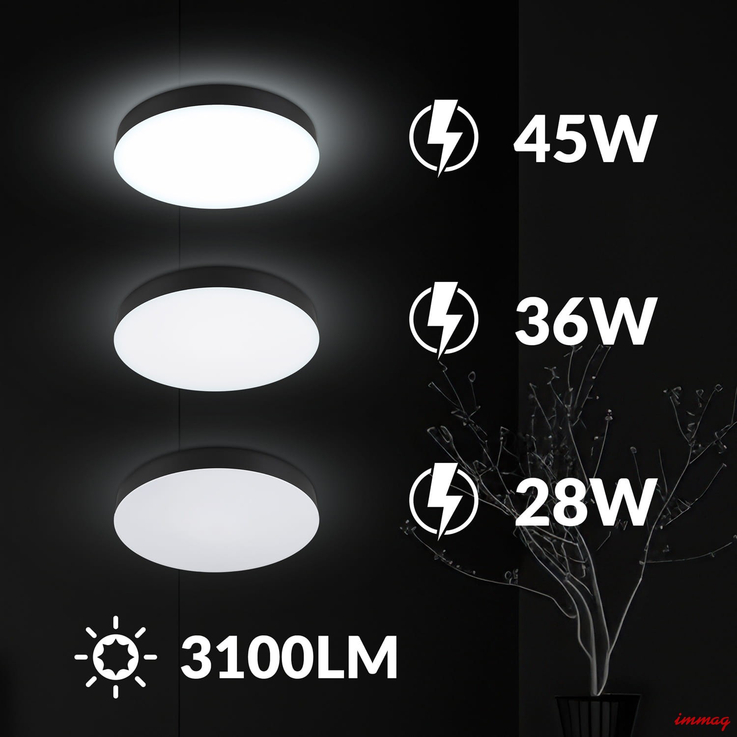 Dostosuj intensywność oświetlenia do wielkości i przeznaczenia wnętrza. Dzięki mocy od 28 W (do mniejszych pokoi) po 45 W (do otwartych salonów) osiągniesz optymalny strumień świetlny do 3900 lm, oszczędzając jednocześnie energię.
