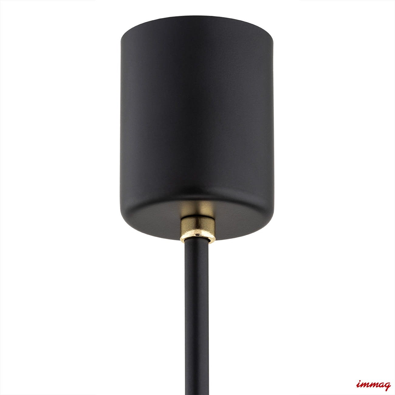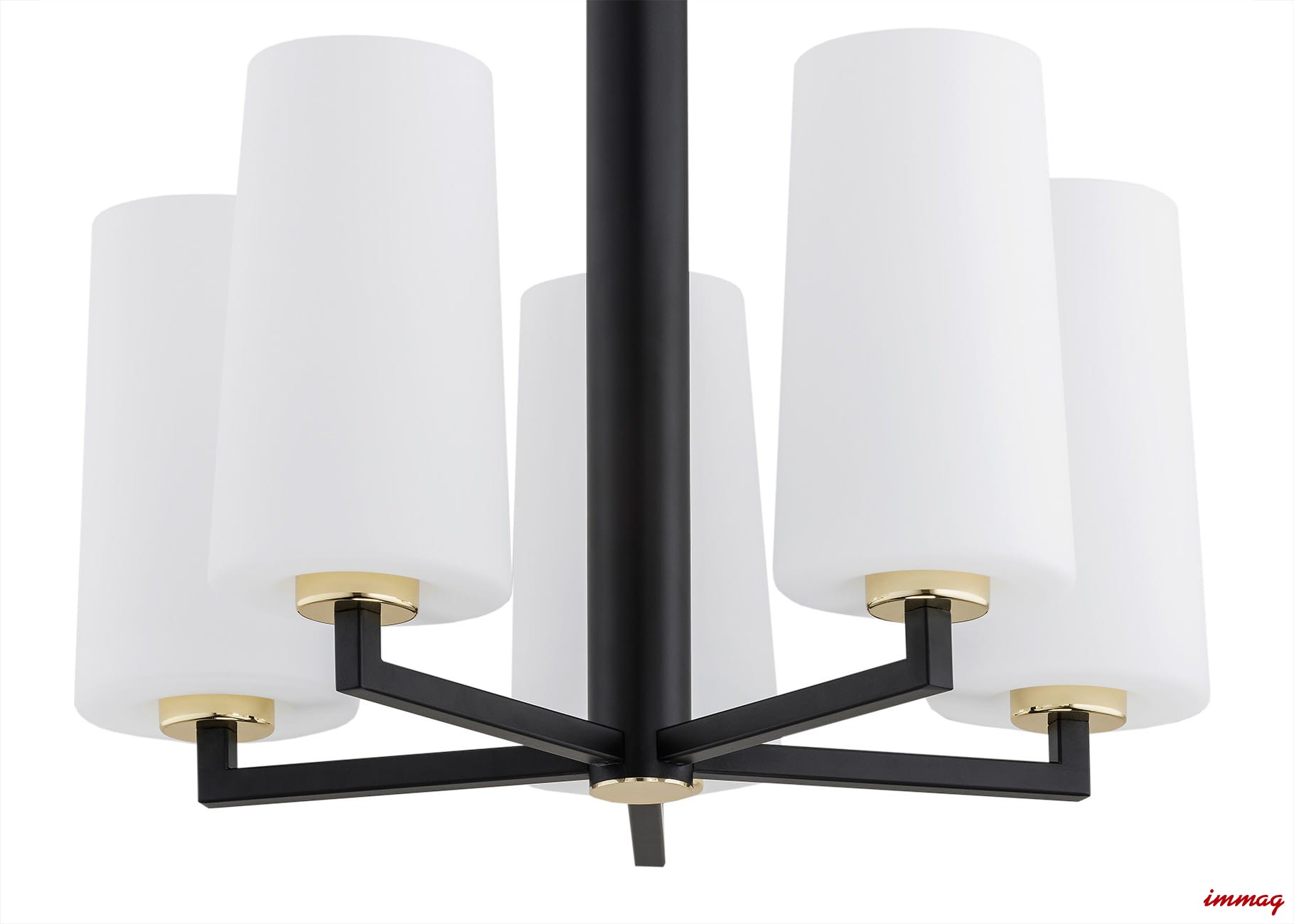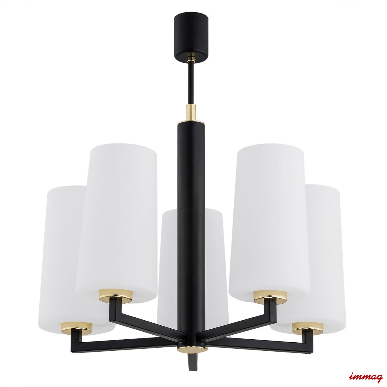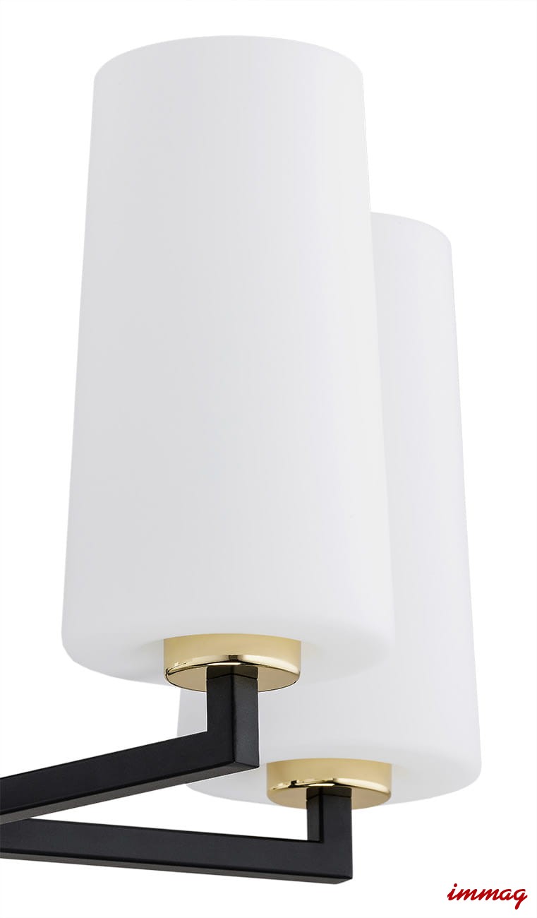 Klosze lampy są w kolorze białym, a czarny metalowy stelaż z dodatkiem złotych akcentów nadają mu unikalnego wdzięku.
